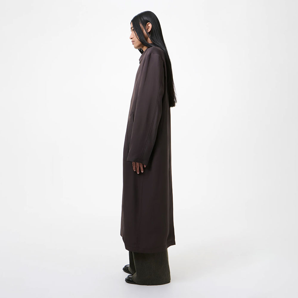 日本製のビスコース素材を使用したスプリングコート。流れるようなドレープと程よいハリ感を併せ持つ生地が、さりげない存在感を放ちます。全体はオーバーサイズかつロングレングスの設計。