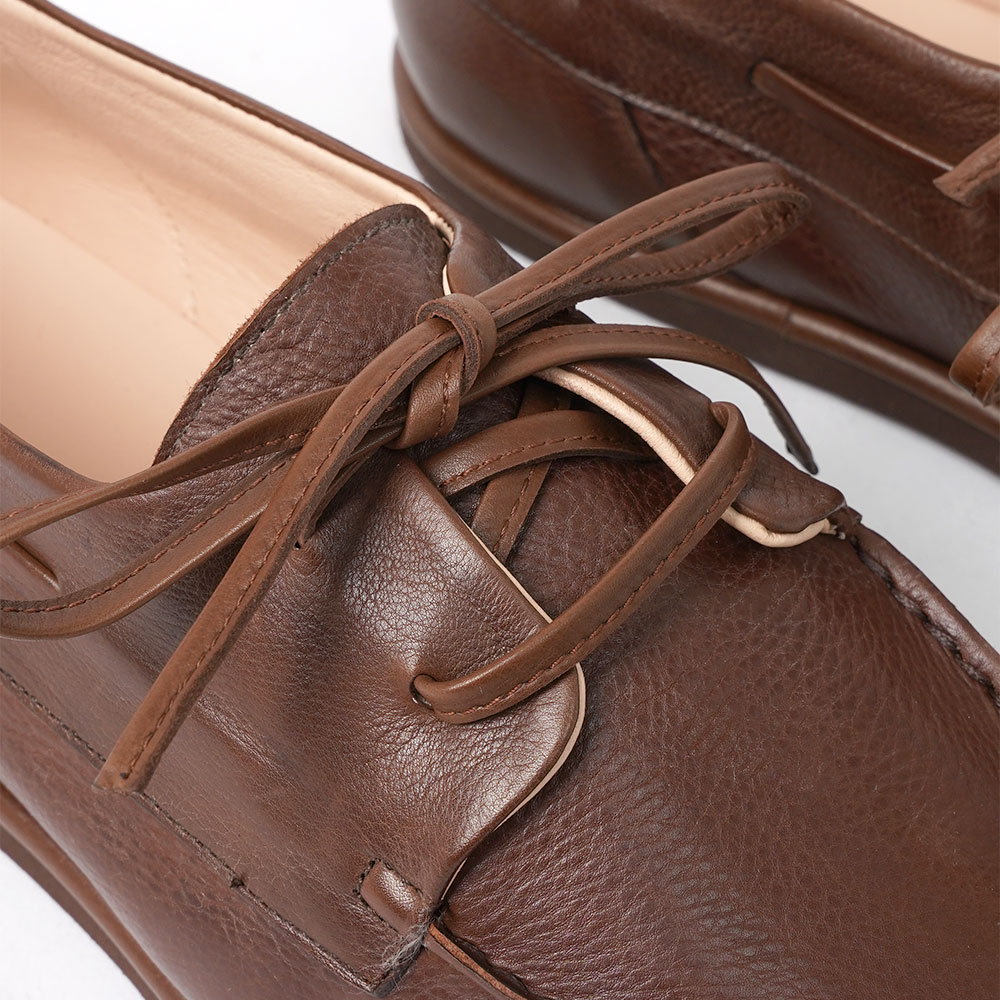 ニュージーランド産の原皮を使用したベビーカーフを採用し、国内の靴職人による手作業の工程を随所に取り入れて丁寧に仕立てたデッキシューズです。