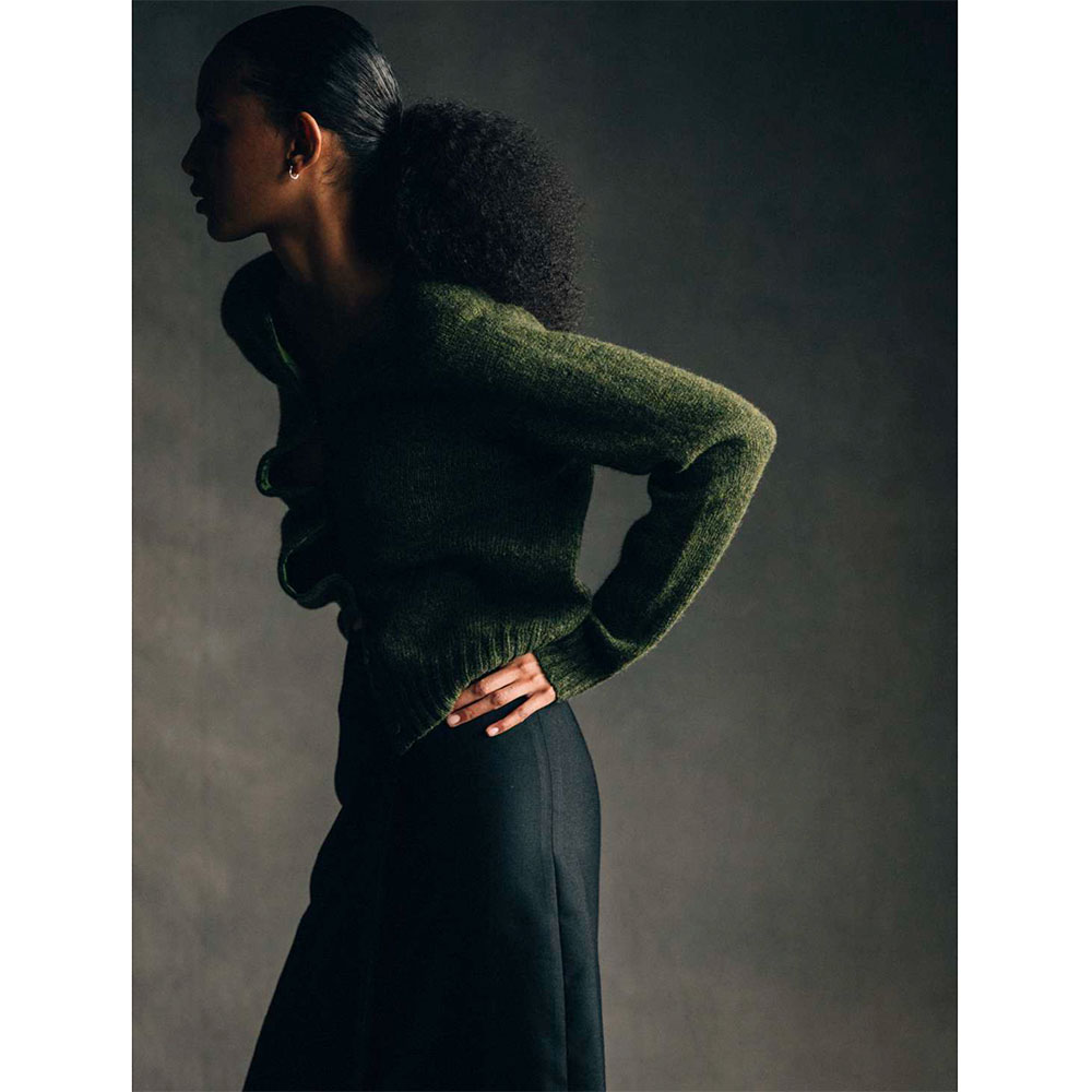 丸編みで一体成型され、編み機から完成した一着の状態で仕上がるため、環境負荷の少ないゼロウェイスト製法も特徴です。
