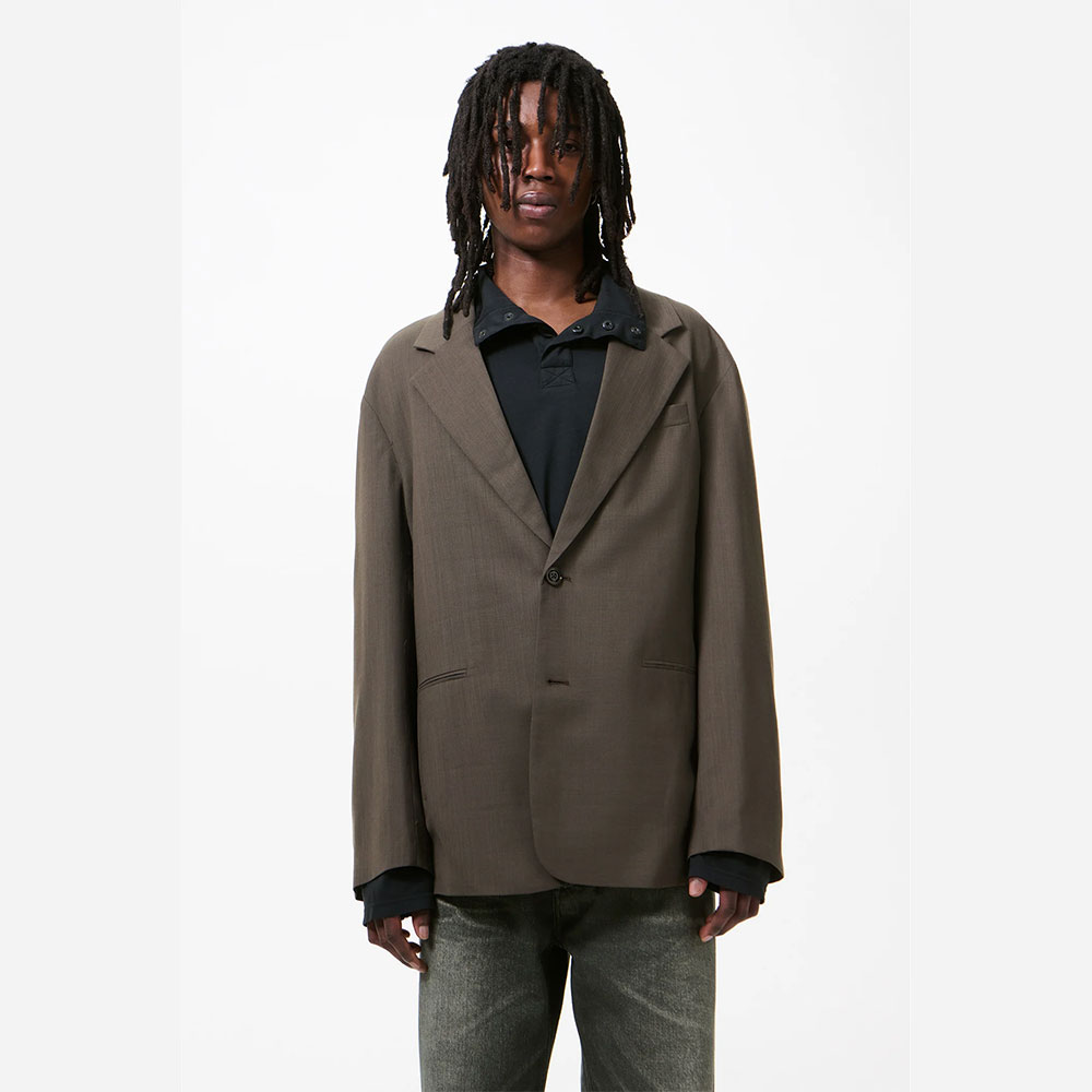 ストームグレーのメリノボイル生地で仕立てられたブラザー。ポルトガルにて生産された上質なスーパーメリノウールのボイルスーツ地を使用し、ゆとりのあるシングルブレストのシルエットに仕上げられています。ワイドなノッチドラペル、丁寧に仕立てられたクリーンなフィニッシュ、ダブルジェットポケット、胸元のウェルトポケット、そしてセンターバックベントを備えた、クラシックで洗練されたディテールが特徴です。