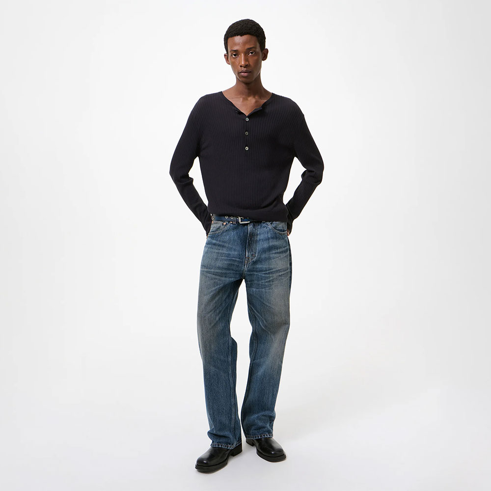 ヴィンテージのミリタリーアンダーウェアから着想を得た、8×1リブの編み地が特徴。ネックラインは繊細なシングルリブで丁寧に仕上げられ、開き具合を調整できるボタンプラケットを備えています。ボタンには上品な光沢を持つマザーオブパール(貝ボタン)を採用しています。身頃はストレートなシルエットを美しく保つため、裾を細かなリブで仕上げ、サイドにはスリットを配しています。袖口はロールヘム仕様とすることで、軽やかで自然な表情を演出しています。