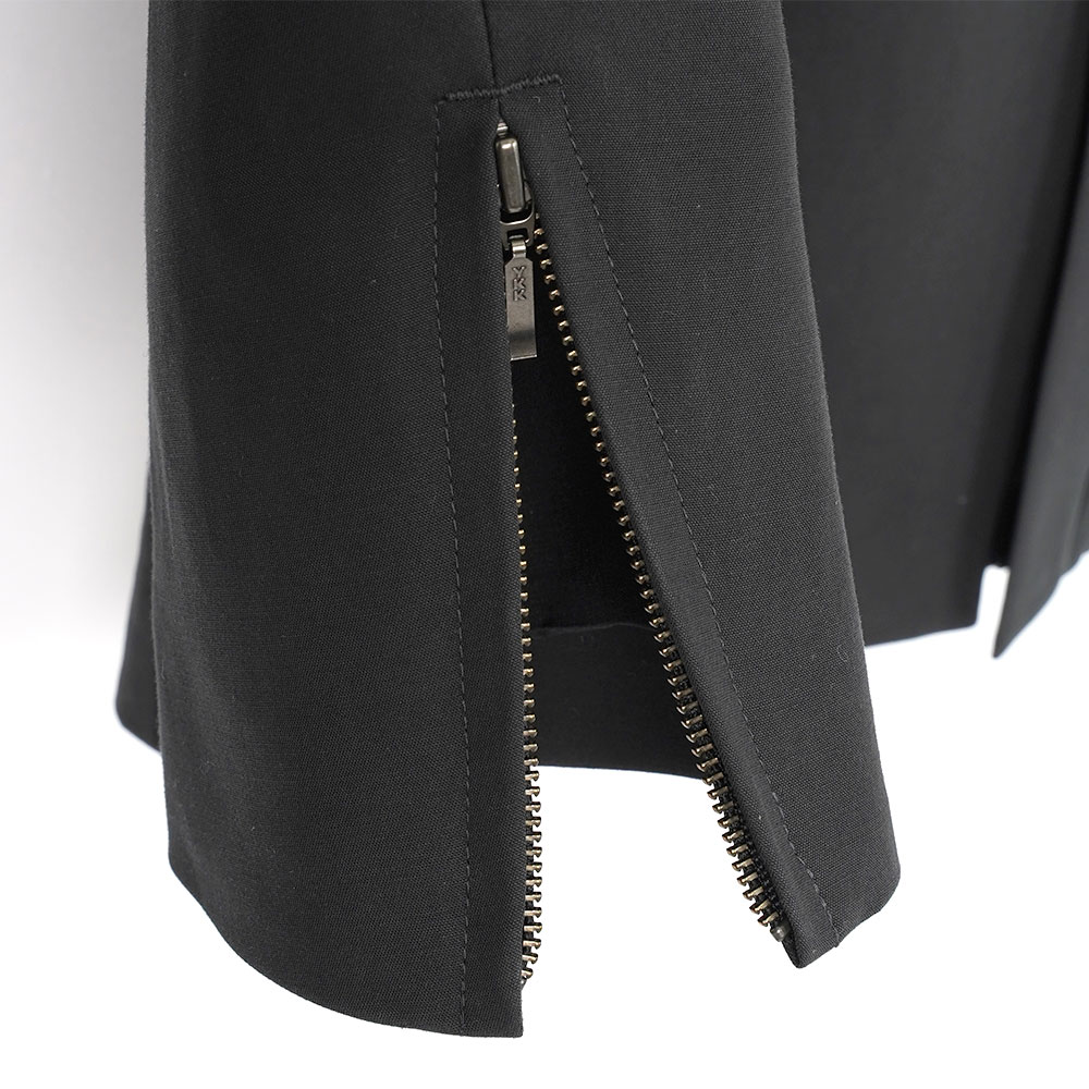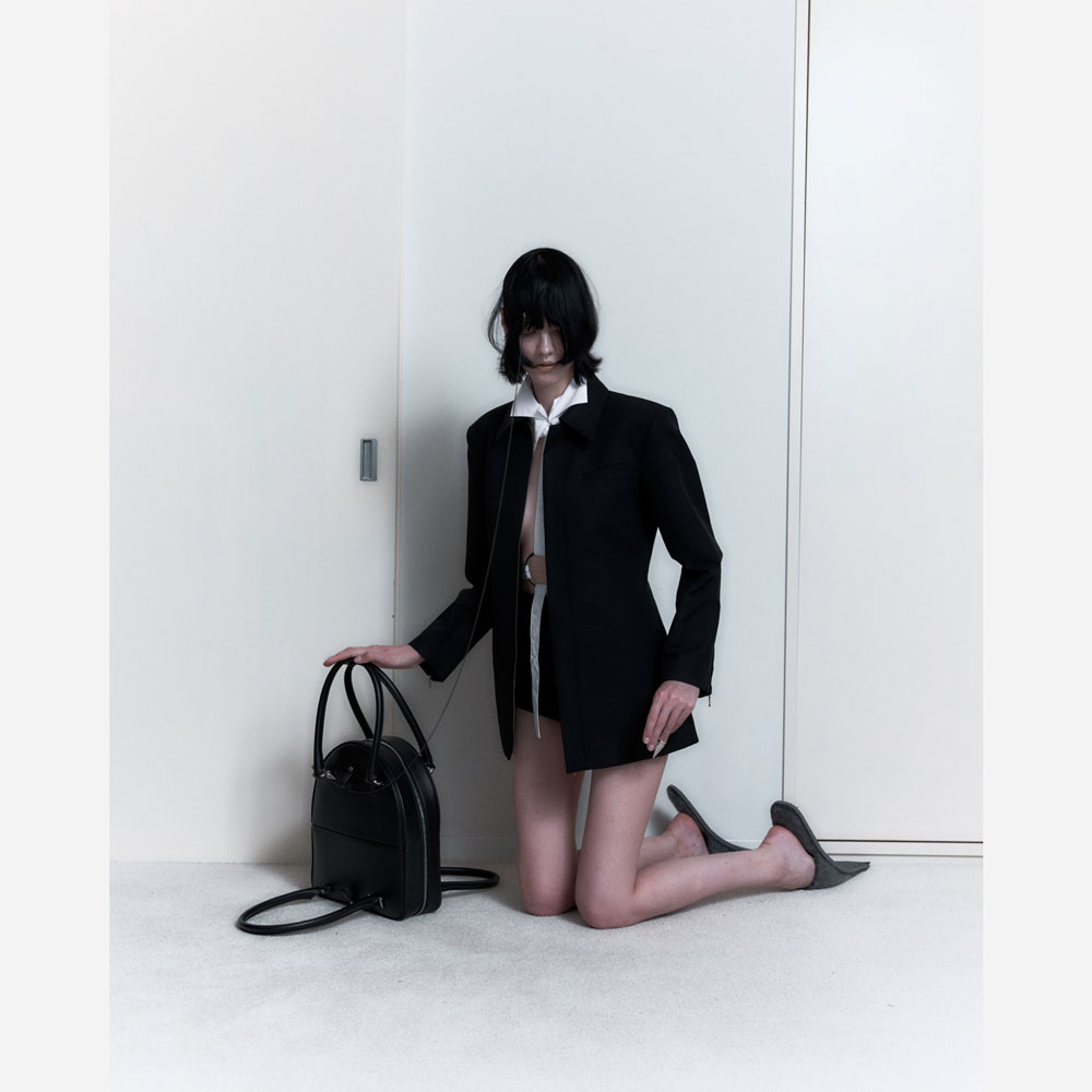 直線的に構築された肩のラインや、身体に沿うタイトなシルエット、手首が覗く絶妙な袖丈が、ブランドらしい緊張感と洗練された佇まいを演出します。