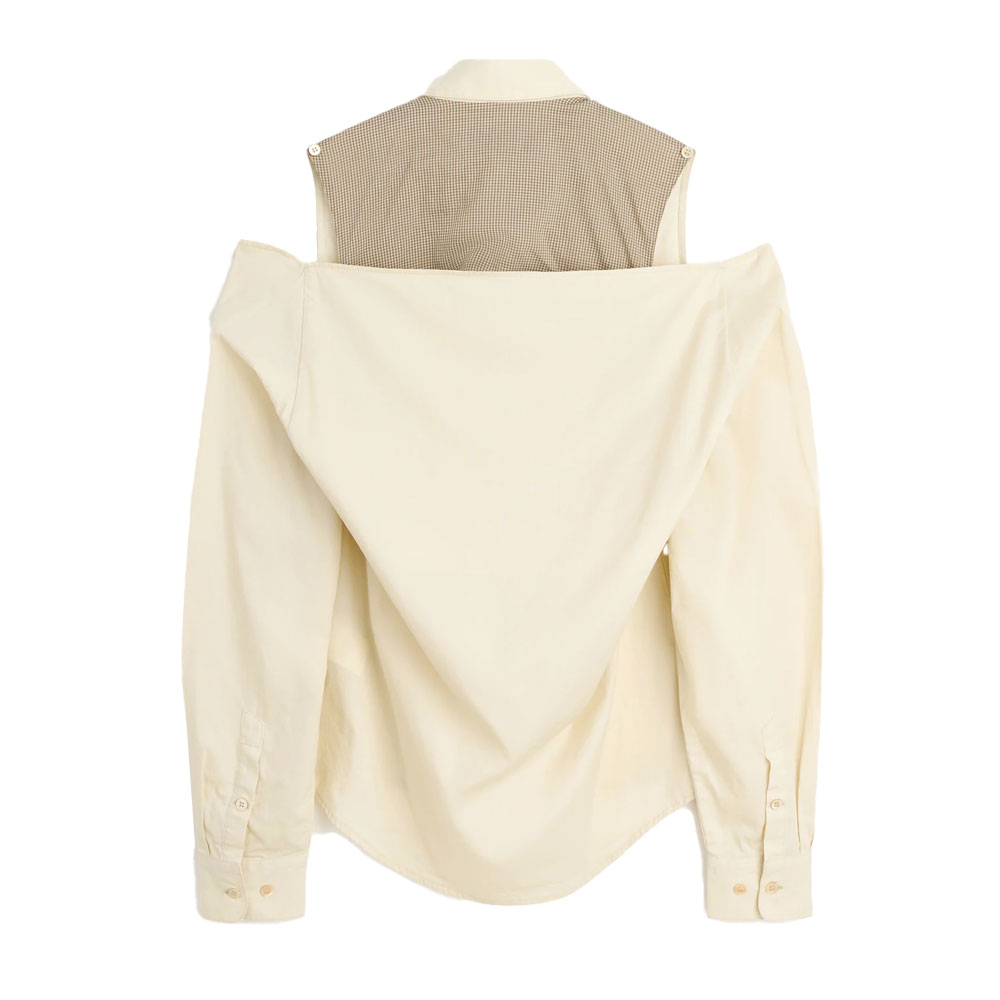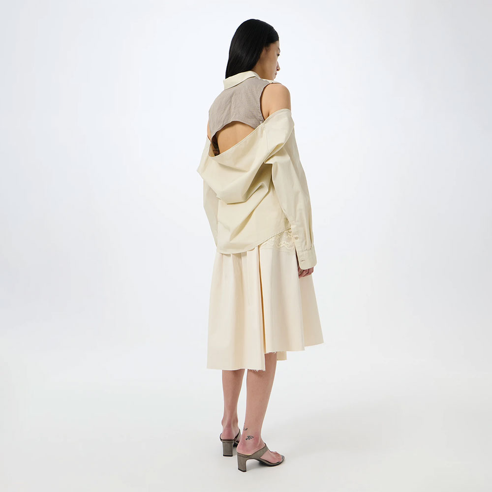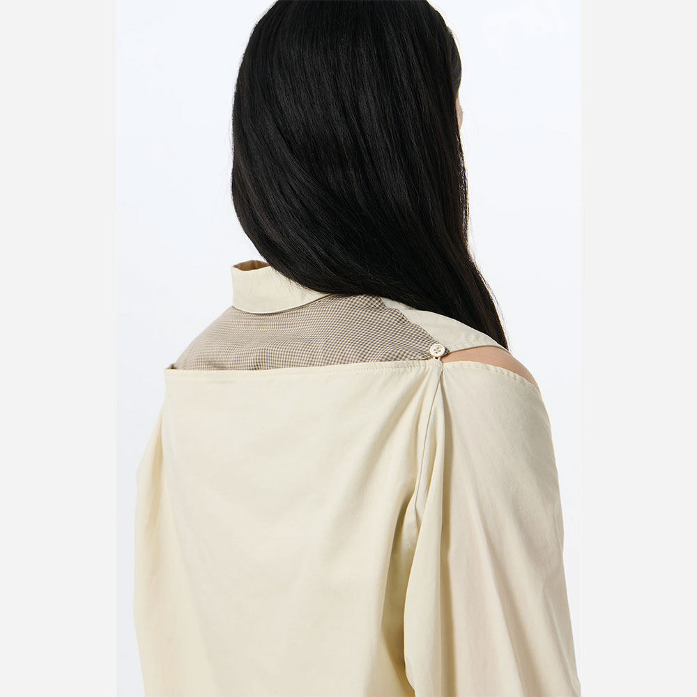 イタリア製のコットン素材を使用した、ロングスリーブシャツ。細やかに織り上げられた生地は、なめらかで上品な質感が特徴。やさしい肌触りと程よい耐久性を兼ね備え、日常使いにも適した仕上がりです。全体はリラックス感のあるロングシルエット。デコンストラクテッドな構造により、ベーシックなシャツとしてはもちろん、オフショルダーでも着用可能なデザインとなっています。スリーブやバックパネルにはあえて崩れるようなディテールを取り入れ、動きのある表情を演出。また、スリーブヘッドのボタンホールをショルダー部分のボタンに留めることで、着こなしに変化をつけることができます。パールボタンを使用するなど、細部まで丁寧に仕上げられた一着。