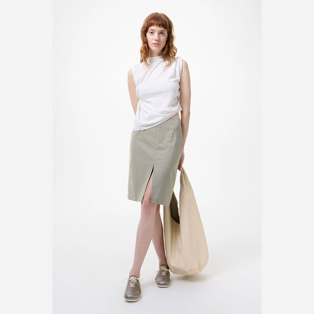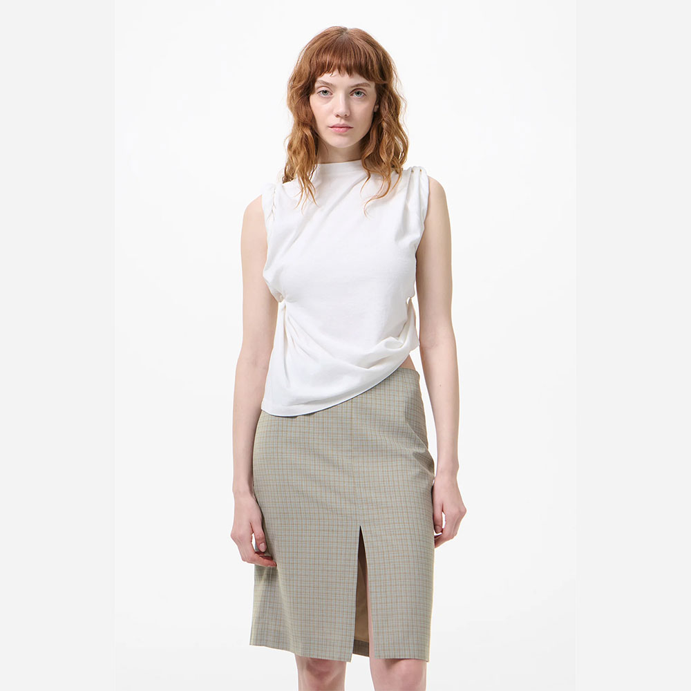 ゆったりとしたシルエットに、首元後ろのギャザーが生み出す独特なツイスト構造が特徴です。