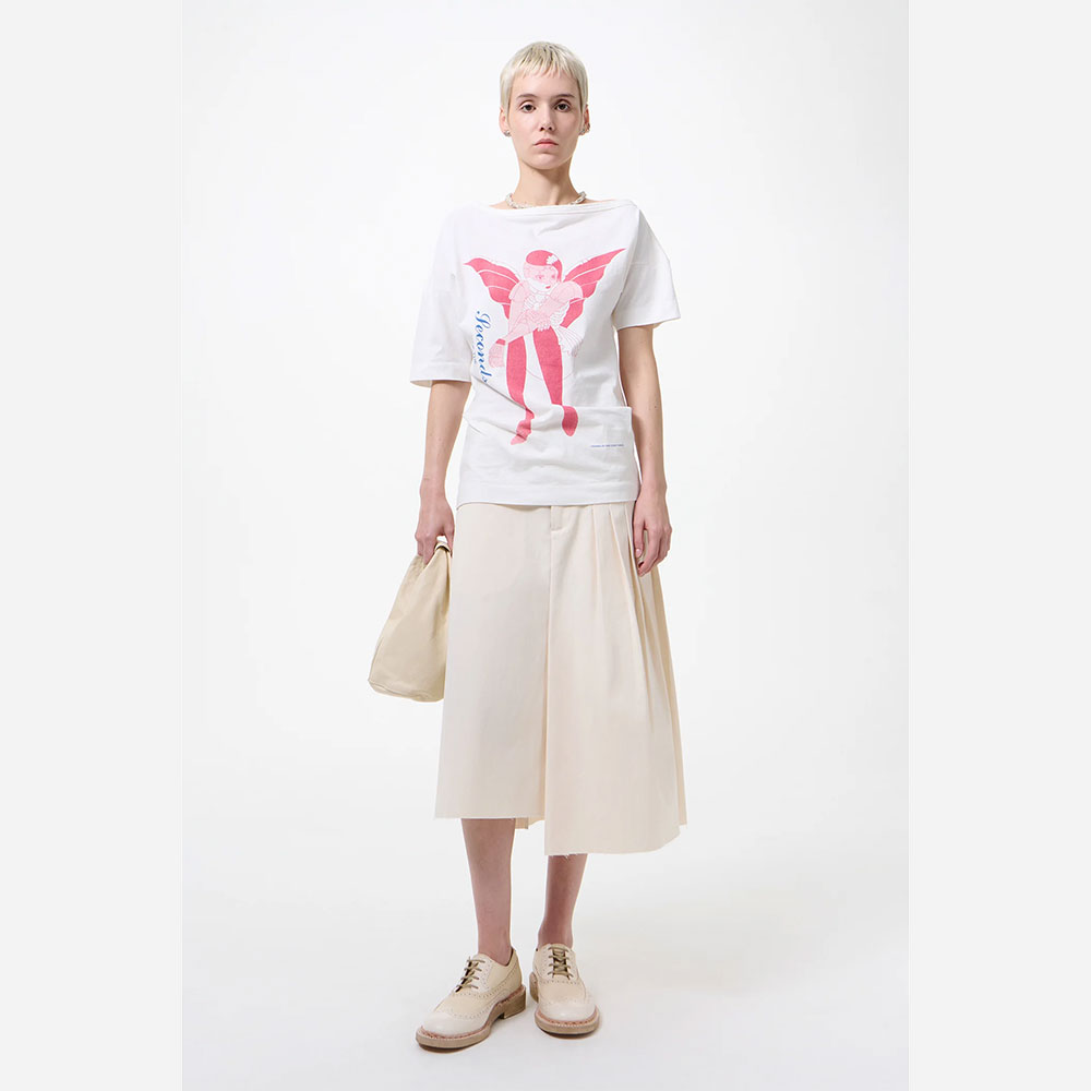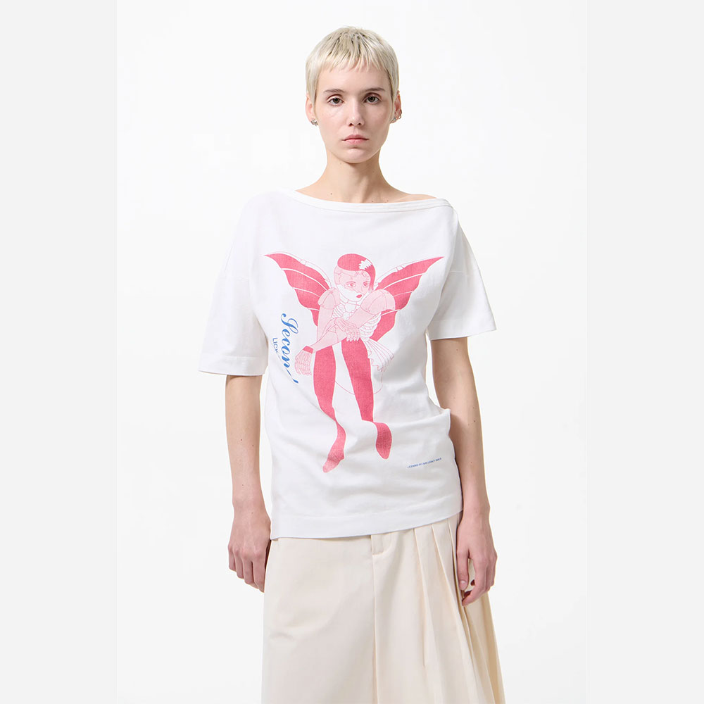 オフショルダーのシルエットが特徴で、トップはややオーバーサイズ、ボトムはヒップに沿うフィット感のあるバランスに仕上げています。