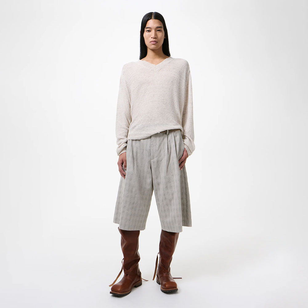 イタリア製のコットン、リネン、ポリエステルをブレンドしたドライタッチな生地を使用した、ショートパンツ。チェック柄と軽やかな織りが特徴で、さらっとした質感がシーズンらしい抜け感を演出します。ワイドなシルエットに、程よく整えられたリラックステーラードフィット。ダブルプリーツやセンタークリースが、ラフな中にも上品な印象をプラスしています。ウエストはグロウンオン仕様で、すっきりとした仕上がりに。サイドのスラントポケットや、バックのウェルトポケットなど、実用性にも優れたディテールを備えています。カジュアルからフォーマルまで幅広く対応し、スタイリングに程よい抜けと品を加えてくれる一着です。