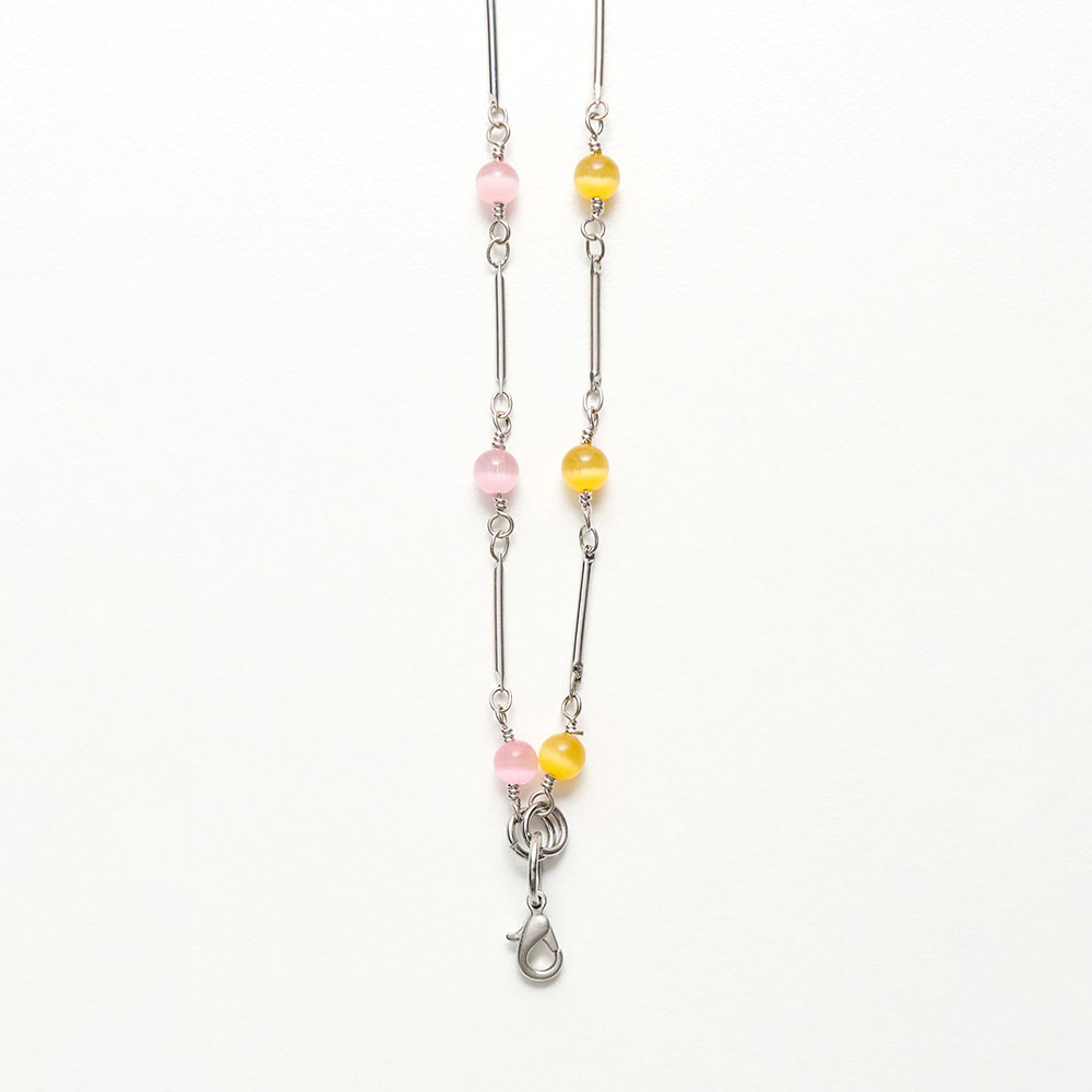 ポルトガル製のブラスチェーンとカラービーズを組み合わせたブレスレット。温かみのあるイエロートーンと、ほんのり冷たさを感じるピンクトーンが重なり合い、繊細なコントラストを生み出します。マーブル状の色合いが、さりげなく個性を引き立てるデザインです。ブラスのダブルリンクチェーンが全体を引き締め、程よい存在感をプラス。シンプルなスタイリングに自然と馴染みながら、アクセントとしても活躍します。留め具はリング&クラスプ仕様で、手首に一重で着用するデザイン。軽やかな着け心地で、日常使いにも取り入れやすいアイテムです。
