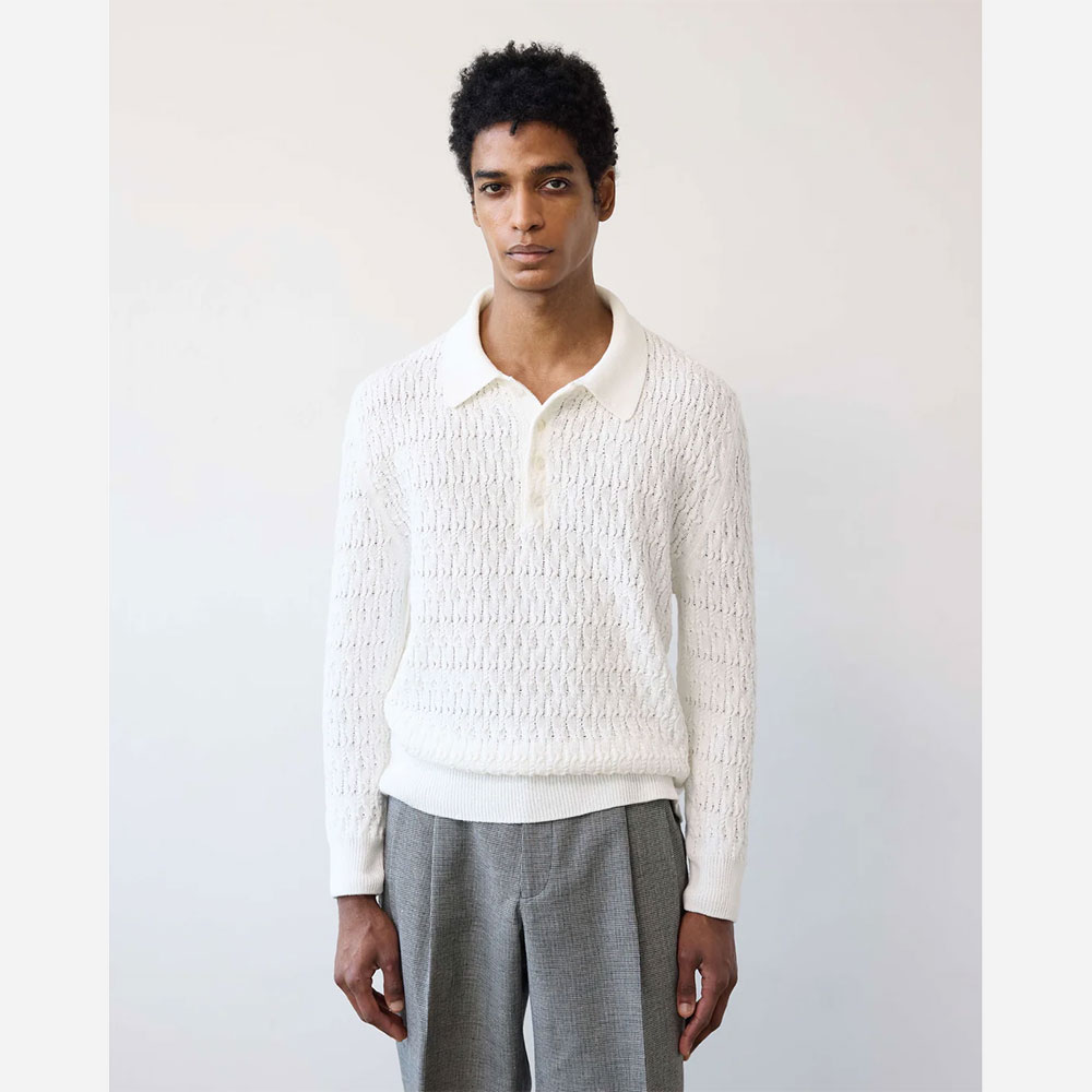 イタリアで編み立てられた上質なコットン100%の糸を使用したケーブルニットポロ。全体に施された立体感のあるケーブル編みが、シンプルながらも豊かな表情を演出します。クラシカルなレギュラーフィットで、着丈はやや短めでバランスの良い設計。上品さと日常使いのしやすさを兼ね備えた一着です。