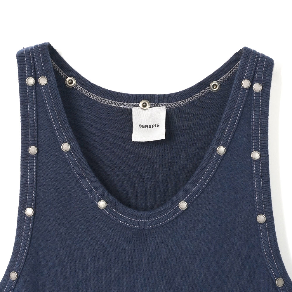 ネイビーのような深みのあるマリンブルーのタンクトップ。ネックラインに沿ってブランド名入りのリベットを施したデザインが特徴です。コントラストの効いたステッチがデザインを引き立てています。