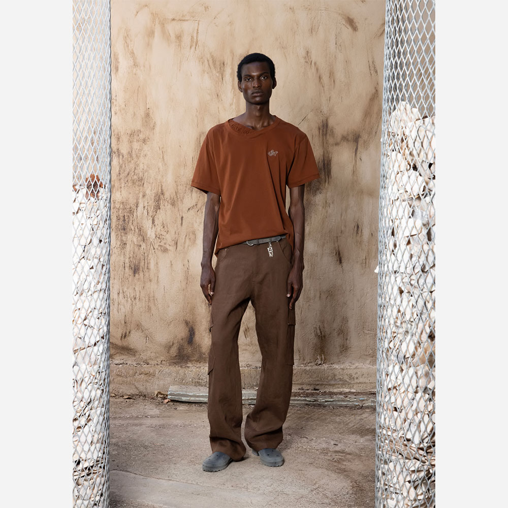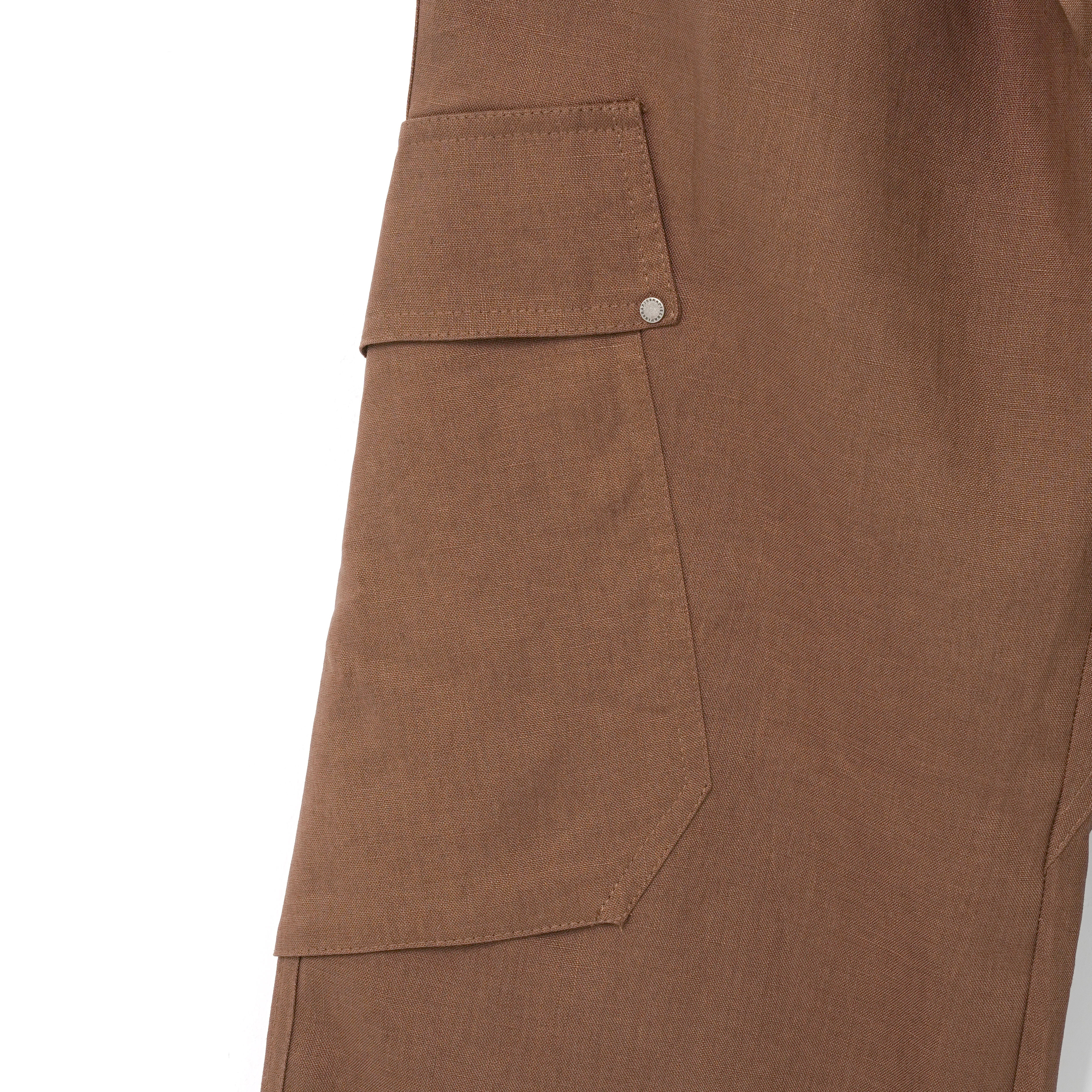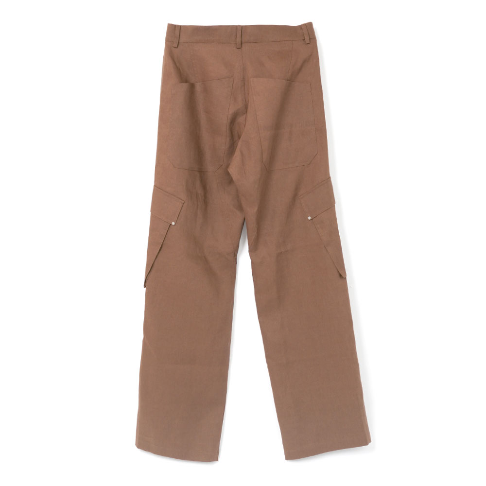 ハリと艶のあるリネン素材を使用したカーゴパンツ。斜めに配置されたカーゴポケットやヒップポケットのフォルムが特徴的な一着です。ブランド名が刻印されたリベットが施され、さりげないアクセントに。ミッドライズ、ワイドフィットのシルエットです。