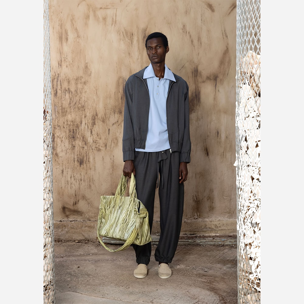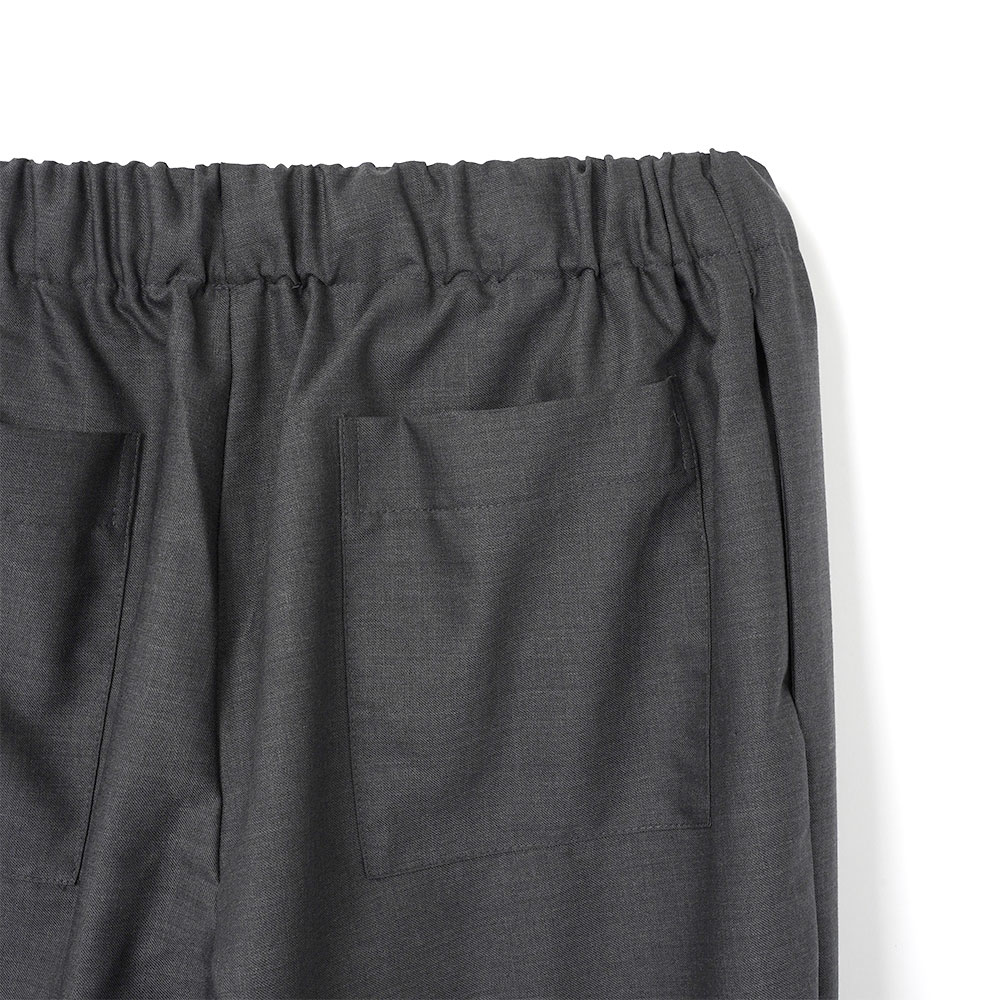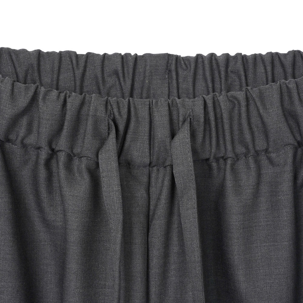 ダークグレーのウール混紡生地を使用した、ドレープ感が美しいイージーパンツ。ウエストはゴム仕様に加え、アクセントとして取り外し可能なアクセサリー付きのドローストリングを配しています。両サイドにポケット、背面にはパッチポケットを2つ備えています。スウェットパンツのようなカジュアルなシルエットながら、素材感により上品さも感じられる一着です。