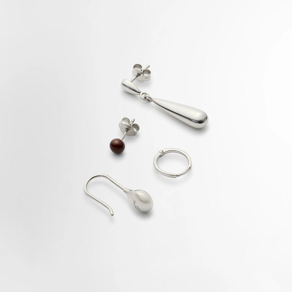 ルメールジュエリーシリーズのユニセックスピアス4点セット。半分が空洞になったペンダントピアス、小さなフープピアス、エナメルのピンピアス。4種類のセット。