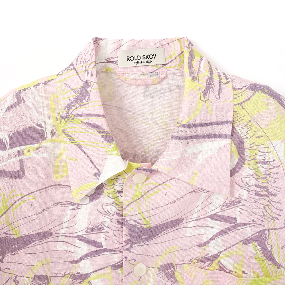 鳥や花をモチーフにしたアブストラクトなペイントを全体にプリントし、存在感のある仕上がりのショートスリーブシャツ。ゆとりのあるボクシーシルエットで、快適にご着用いただけます。涼しげなリネン素材を使用し、リゾート感漂う一着です。