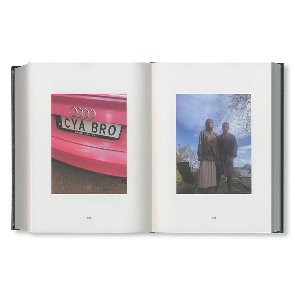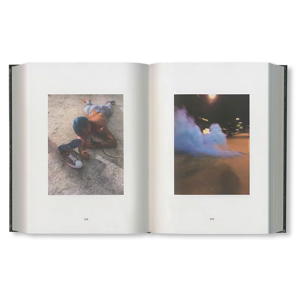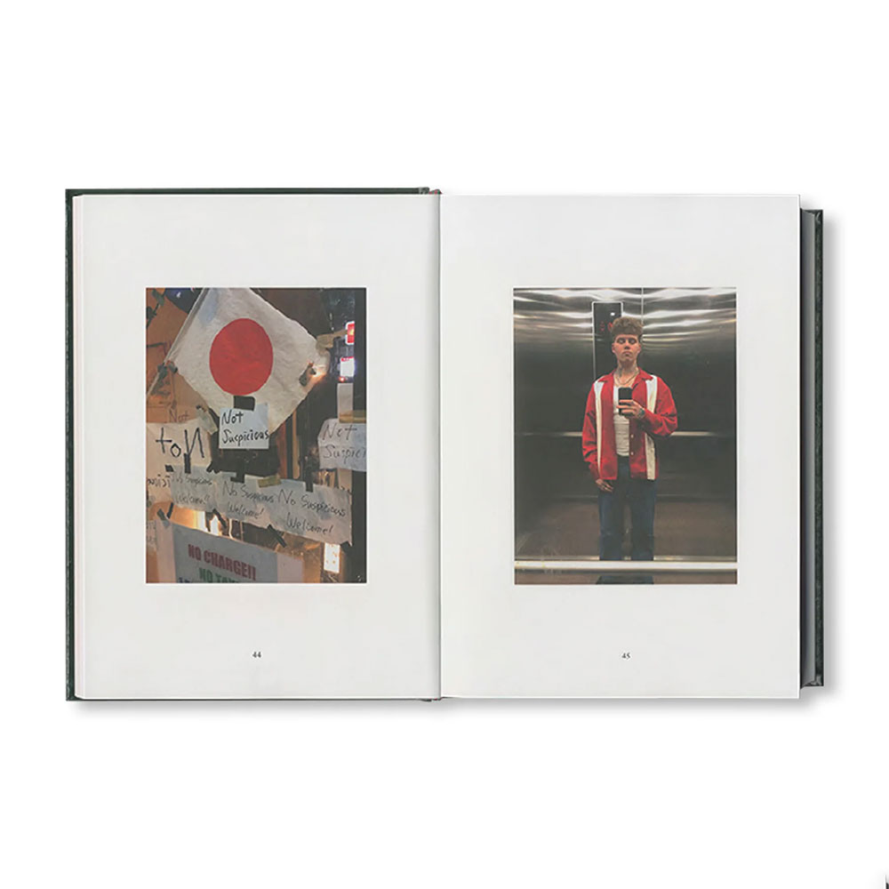 iPhone 6、8、X、SEで撮影された574枚の画像を収録した本作は、作者の自発的かつ積極的な芸術制作の姿勢を象徴していると言えよう。スマートフォンの個人的なフォトライブラリーに保存された親密で即興的なイメージ群が、古典的な本の形に再構成されている。イタリアで制作された本書に用いられている素材は、カーヴァ・デ・ティッレーニの街にある製本会社「Legatoria Industriale Artigianale」で500年続く聖書製本の伝統技術によって生かされている。赤い箔押しのタイポグラフィがメランジ状のグリーンの表紙を飾り、背には赤いシルクのリボンが栞としてあしらわれ、美しさの共鳴をさらに高めている。そのような古典が持つ強さや耐久性を挑発するように、拡散して「バズる」エフェメラのしるしとして、銀色にぎらつくステッカーのシートが付属している。