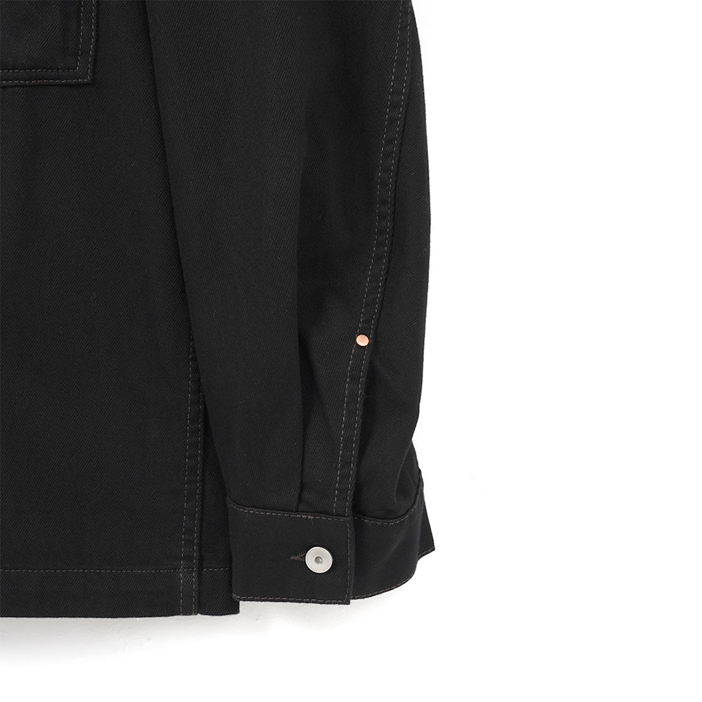 中厚のブラックデニムを使用し、無骨なワークウェアの要素をベースにしながらも、ブランド特有のクリーンなラインで洗練された印象に仕上げられています。