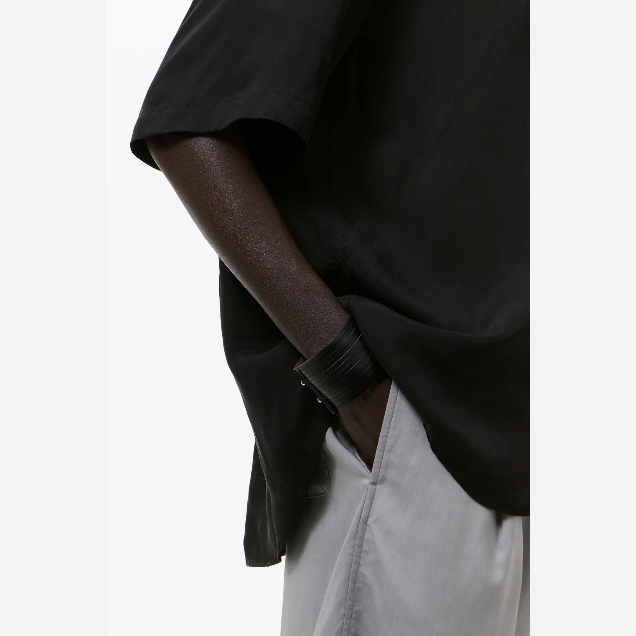 シルエットはレギュラーフィットのストレートラインで、すっきりとした印象に仕上げています。半袖デザインにより軽やかな着心地を実現し、フロントには上品な輝きを放つ真珠貝ボタンを採用。さらに、カーブした裾がさりげない動きを加え、洗練されたスタイルを演出します。