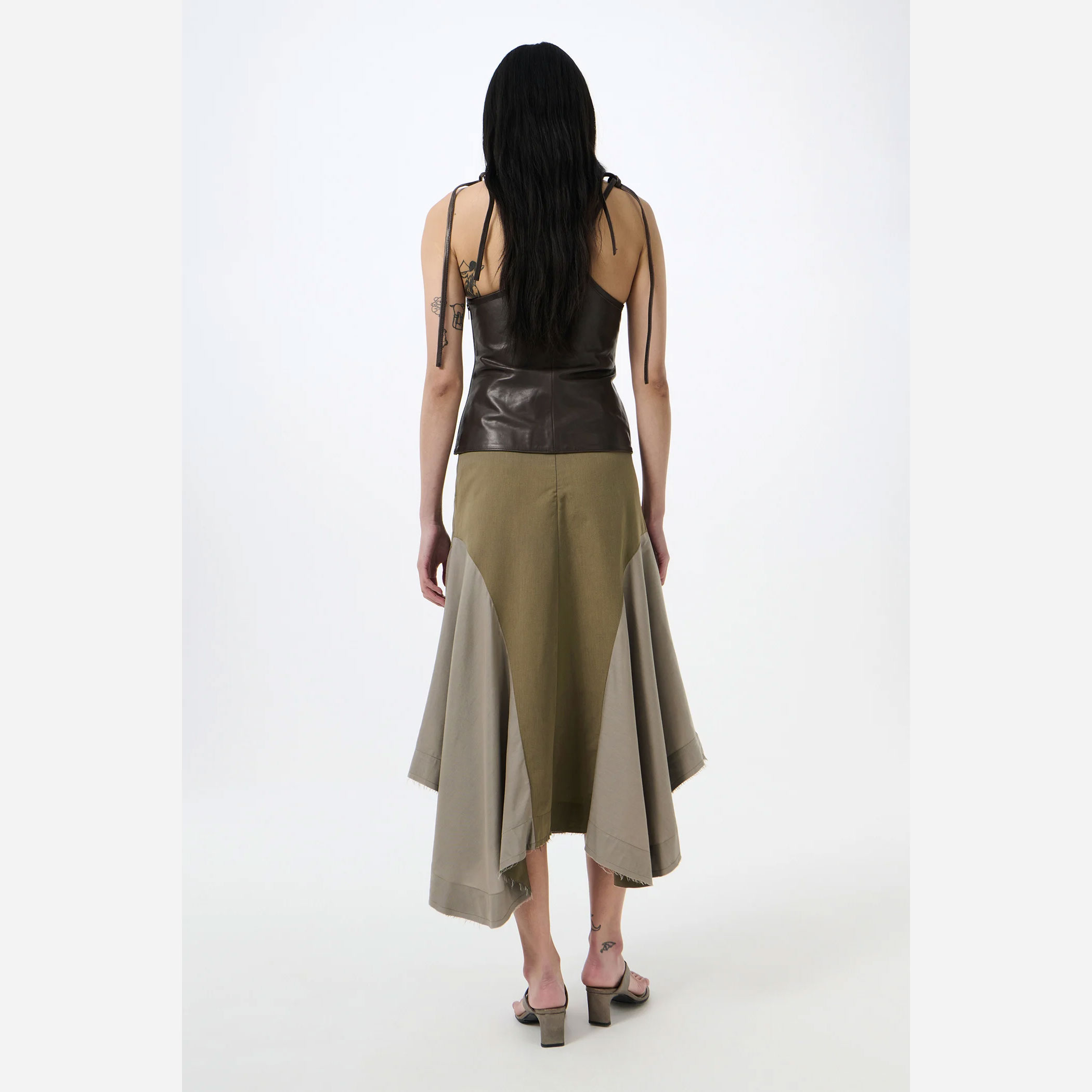 背面には隠しファスナーとフック&アイ留めを配し、すっきりとした仕上がりに。切りっぱなしの裾がラフなニュアンスを添えつつ、ウエスト内側にはウェビングで補強されたバンドを施し、伸びを防ぎながら安定したフィット感を実現しています。