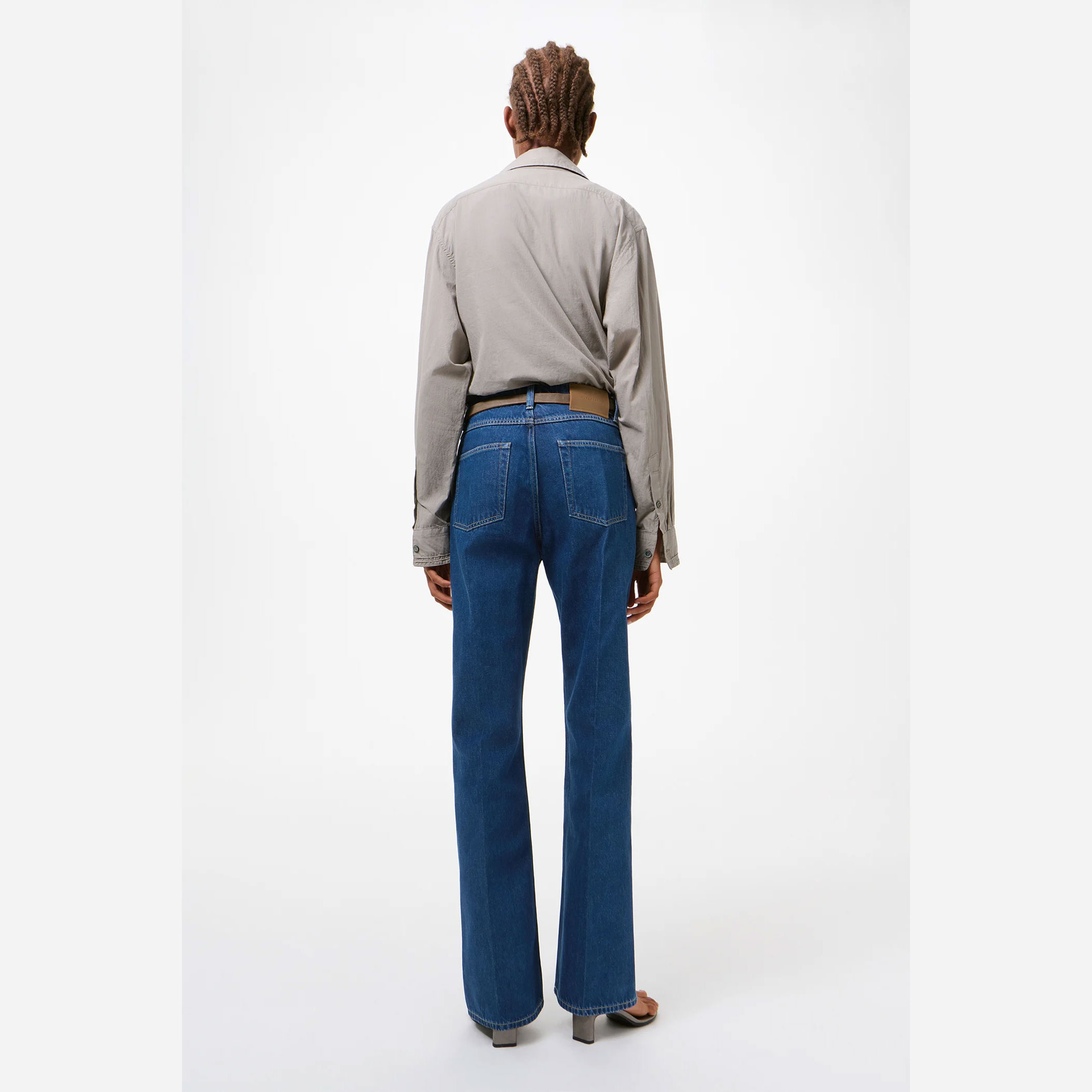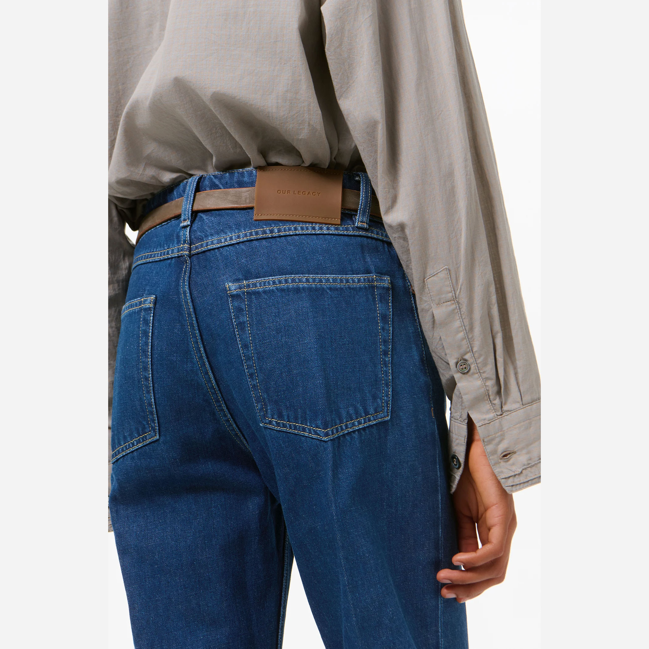ミッドウエスト設計に、ストレートなラインから緩やかに広がるブーツカットの脚部が、美しいバランスを演出。プレス加工による折り目がシャープな印象を加え、カジュアルでありながら上品な佇まいに仕上げています。5ポケット仕様やジップフライなど、実用性にも配慮し、「Our Legacy」のラバーパッチがさりげないアクセントとなっています。