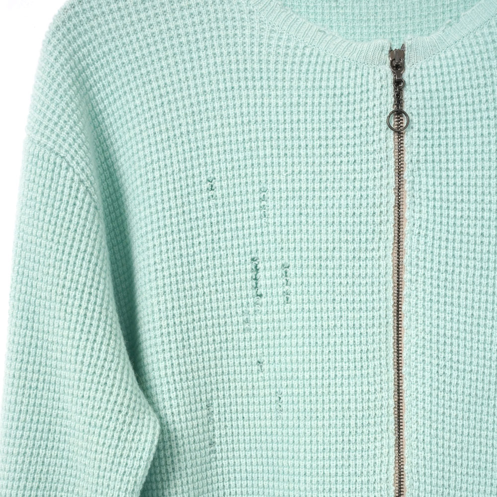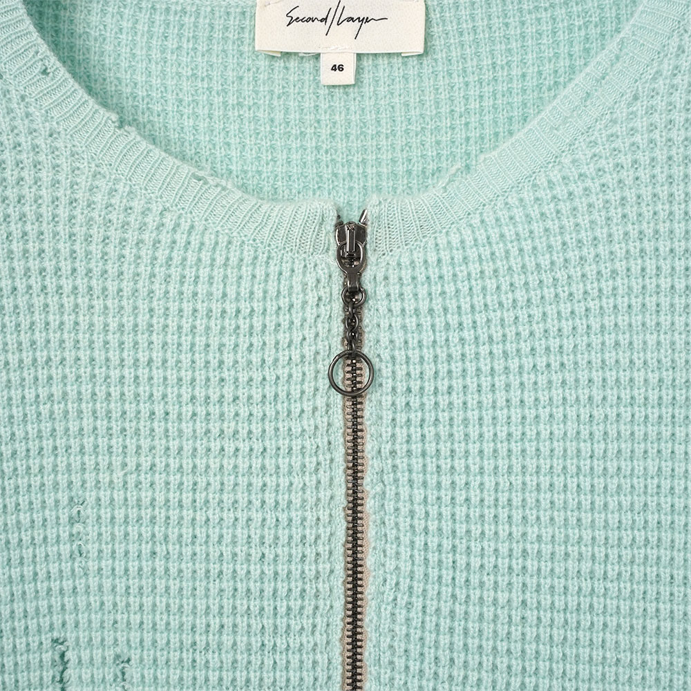 爽やかなミントカラーが印象的で、春夏シーズンの軽やかなスタイリングに心地よいアクセントを添えます。フロントにはジップ仕様を採用しており、開閉によってスタイリングの幅を広げられるのも魅力のひとつ。