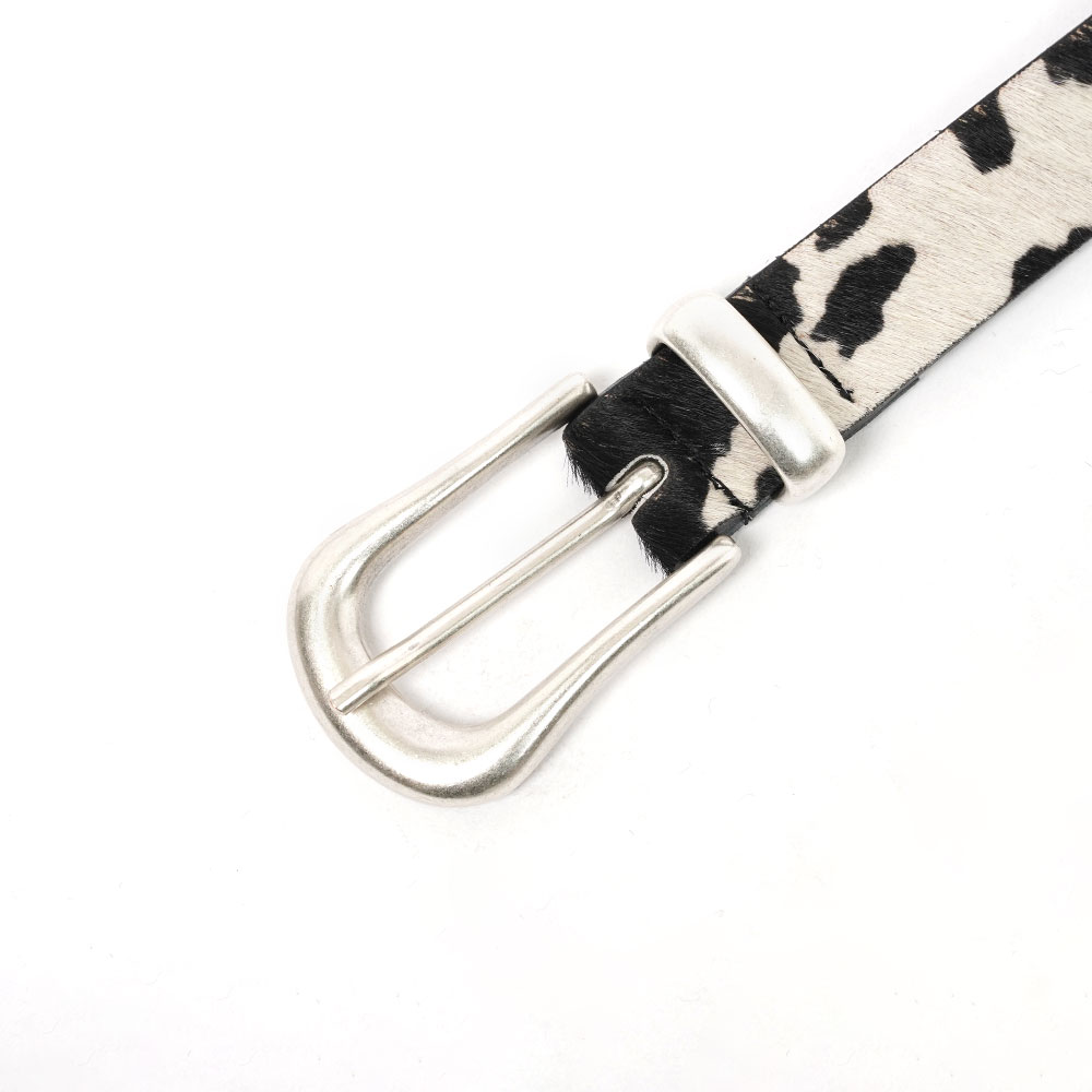 モノトーンのカウ柄が印象的なデザインで、落ち着いた中にも個性を感じさせる一本です。ウエスタン調のバックルが程よい存在感を放ち、スタイリングに自然なエッジを加えます。