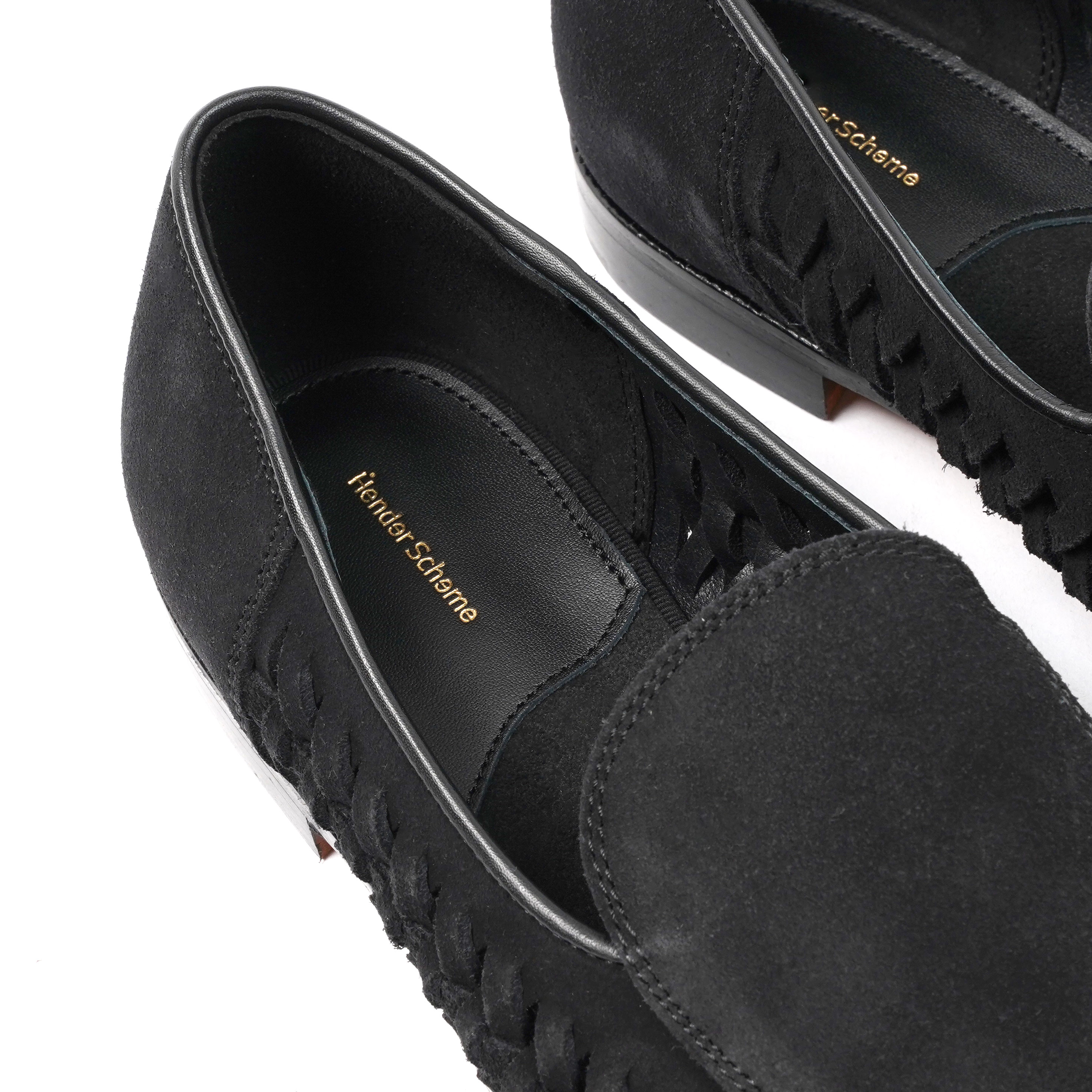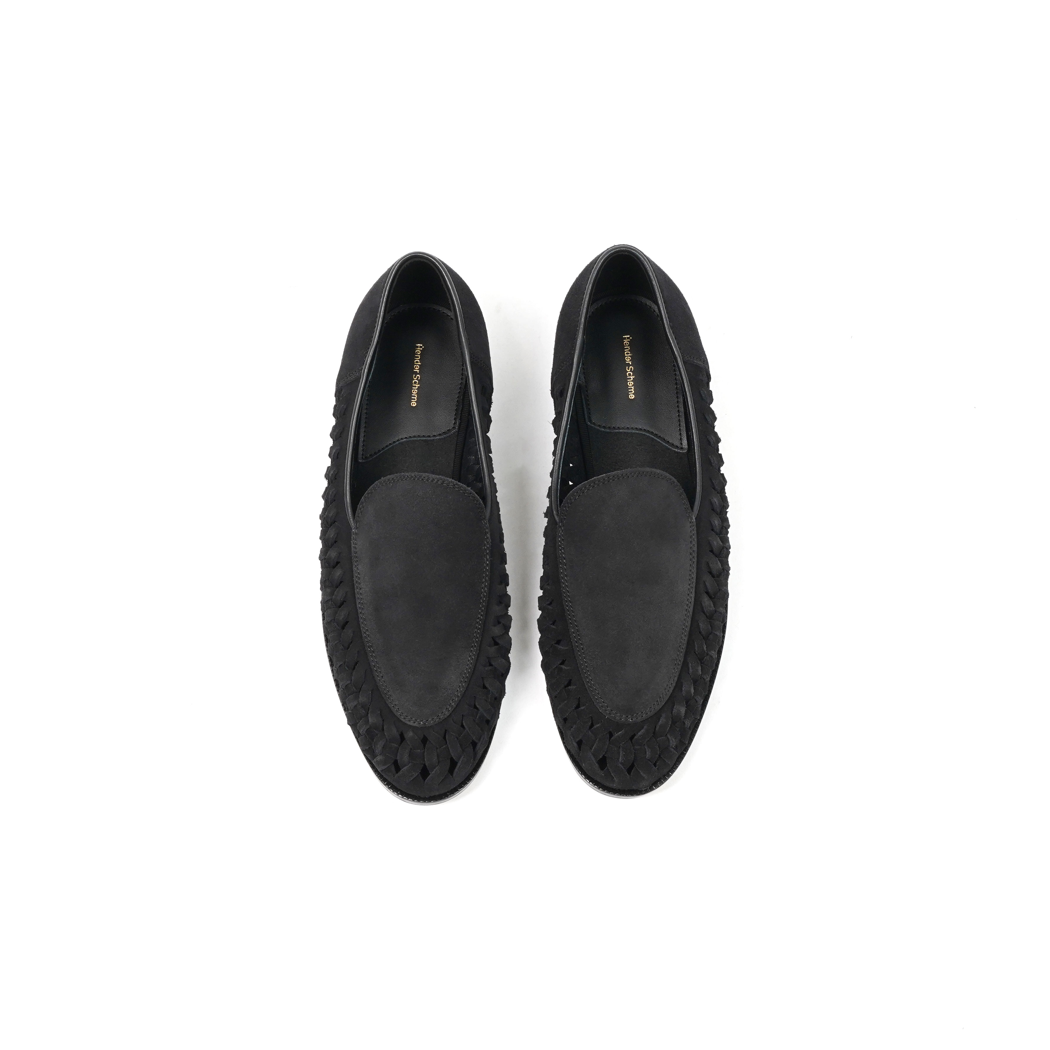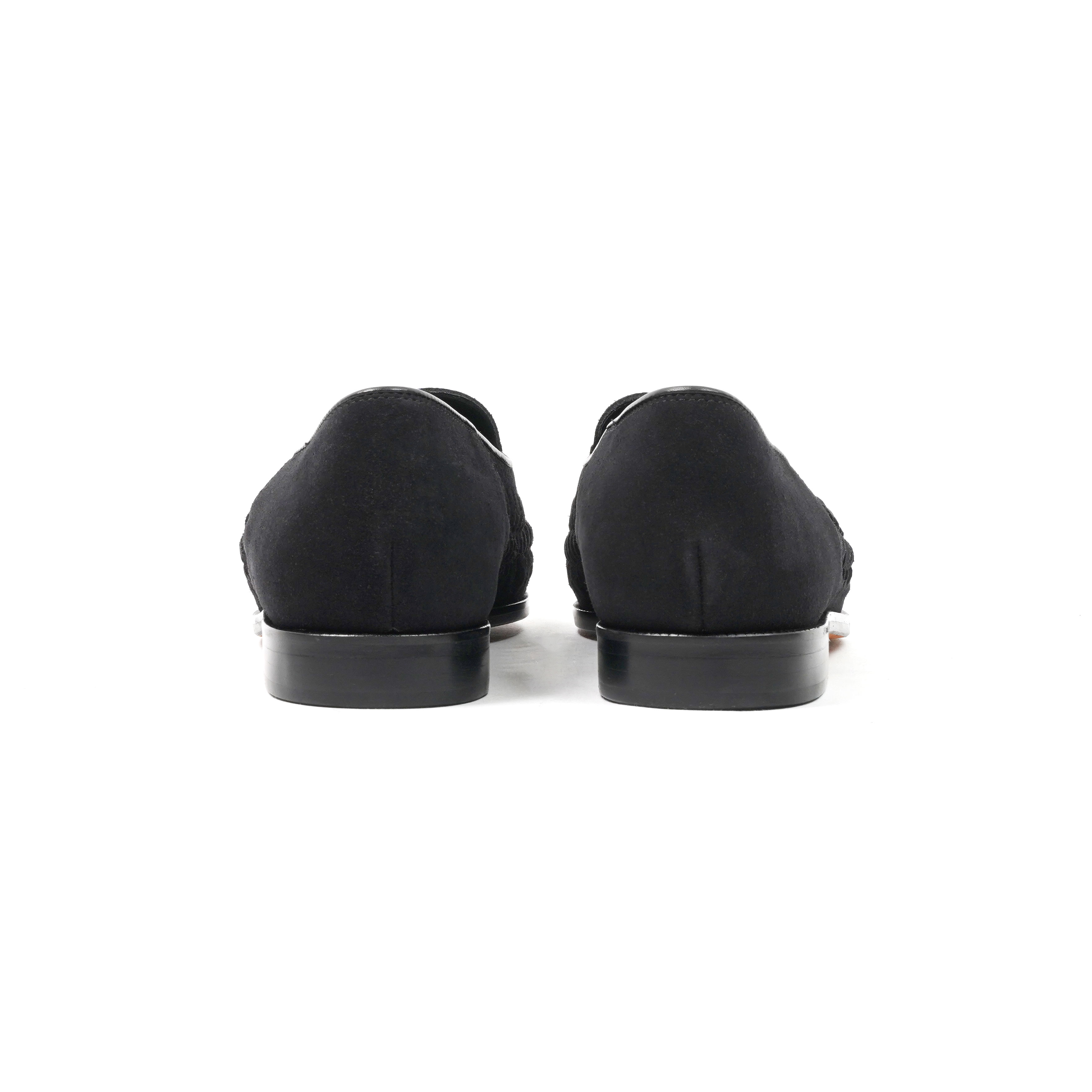 レザーレースを編み込むことでメッシュ状のディテールを形成したスウェードローファー。一枚革の柔らかな質感と、足を包み込むような軽やかな履き心地。スリット部分からさりげなく足元が覗くことで、ソックスや素足などスタイリングによって異なる表情を楽しめます。製法はドレッシーな仕立てをベースにしながら、抜け感のあるデザインとのバランスが◎。レザーソールによる上品さと、スリッポンならではの軽快さを兼ね備えた一足です。素材には天然皮革を使用しているため、色味や風合いには個体差があり、履き込むほどに表情が深まる経年変化も魅力のひとつ。