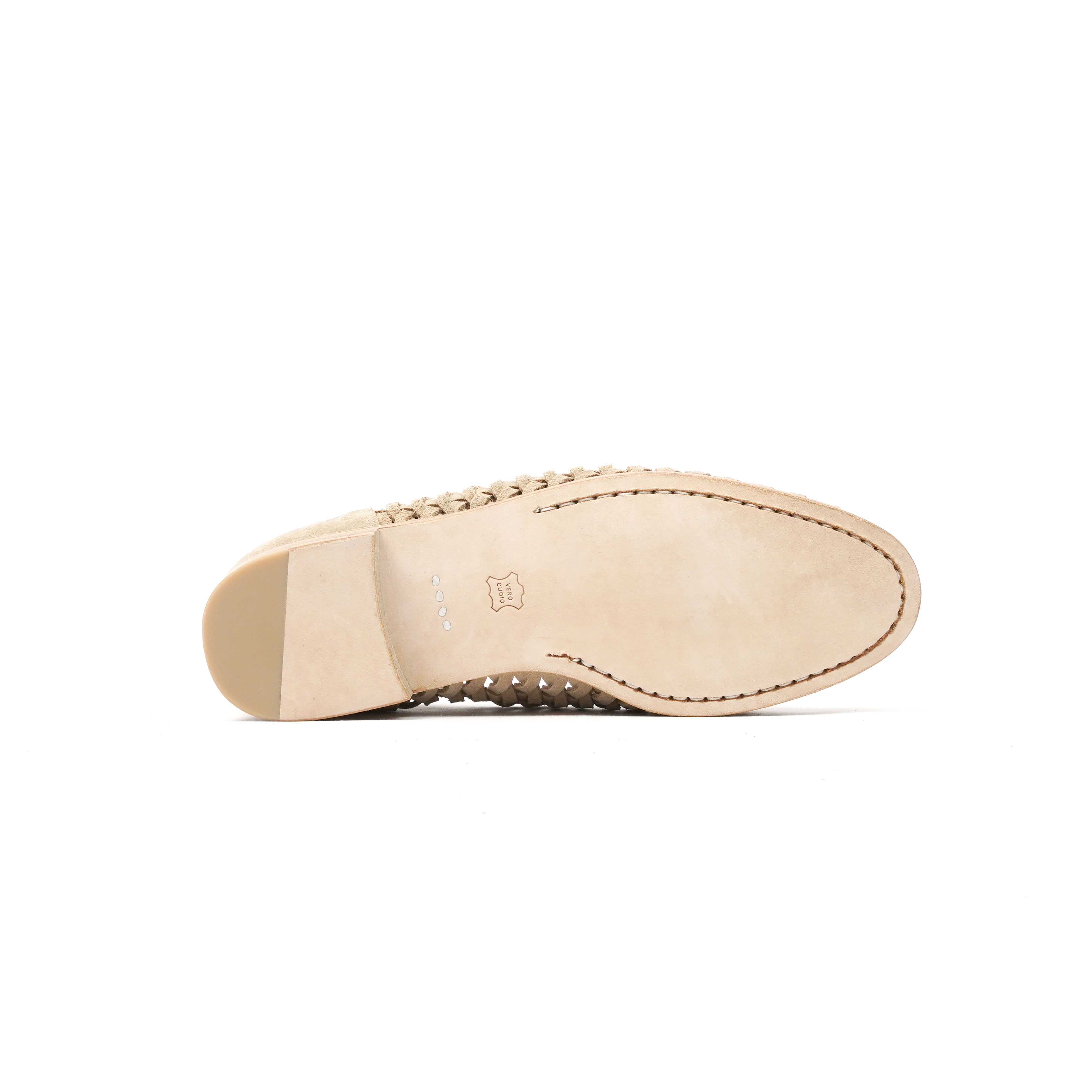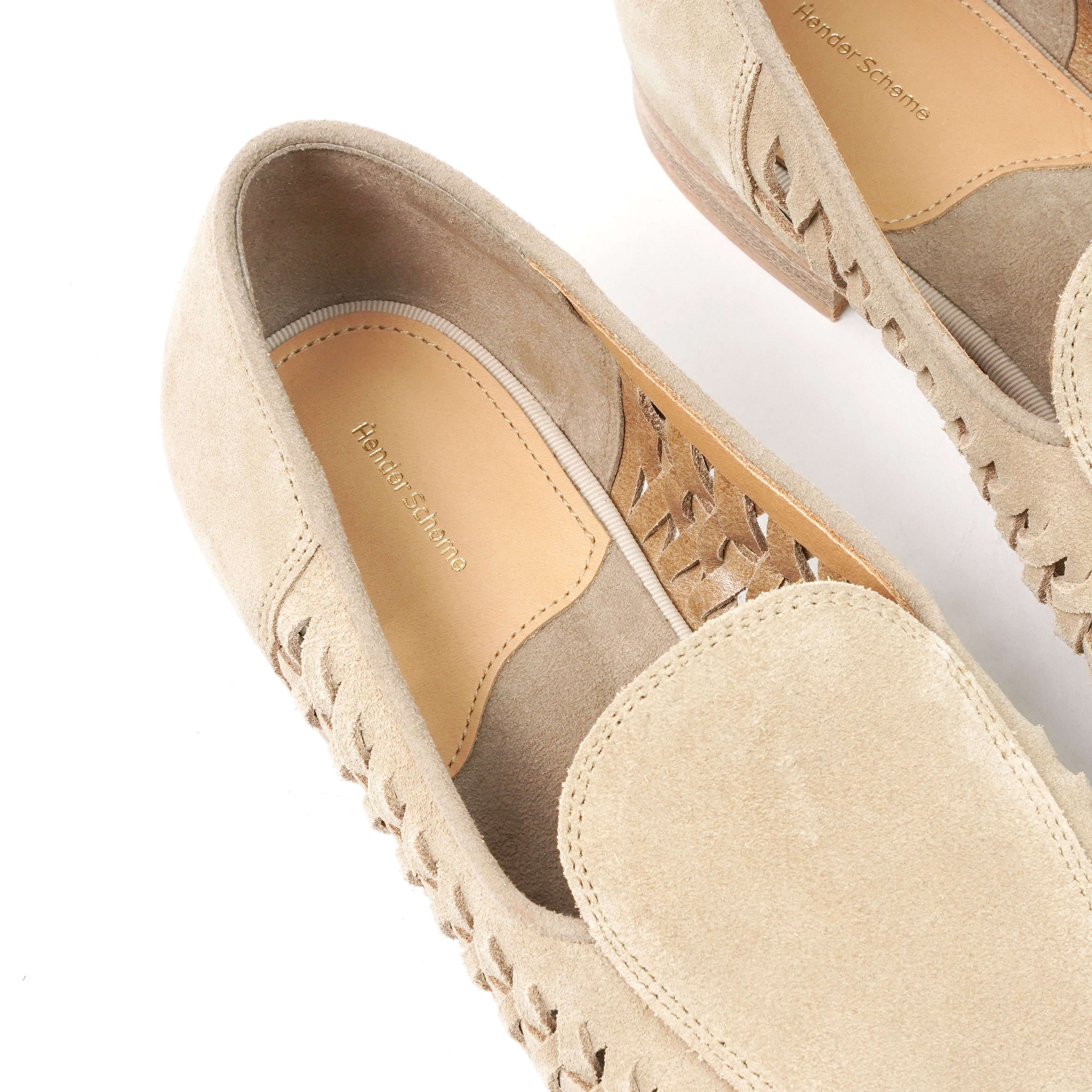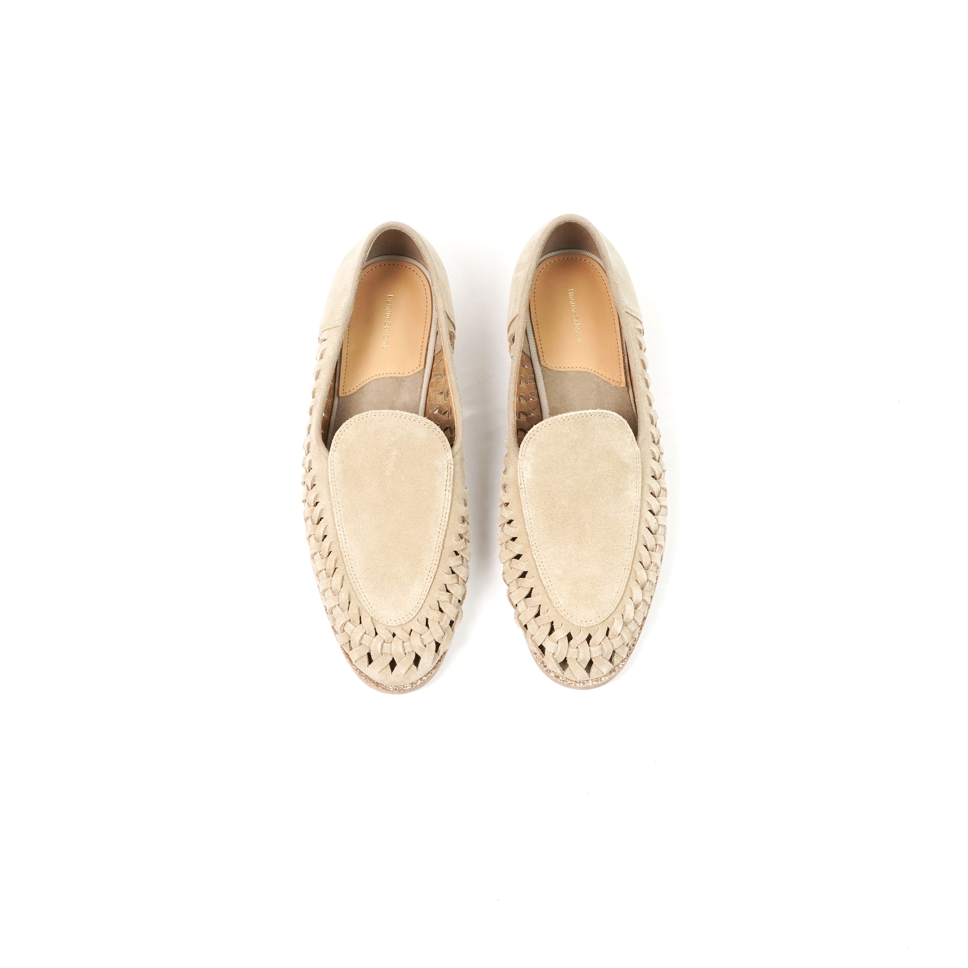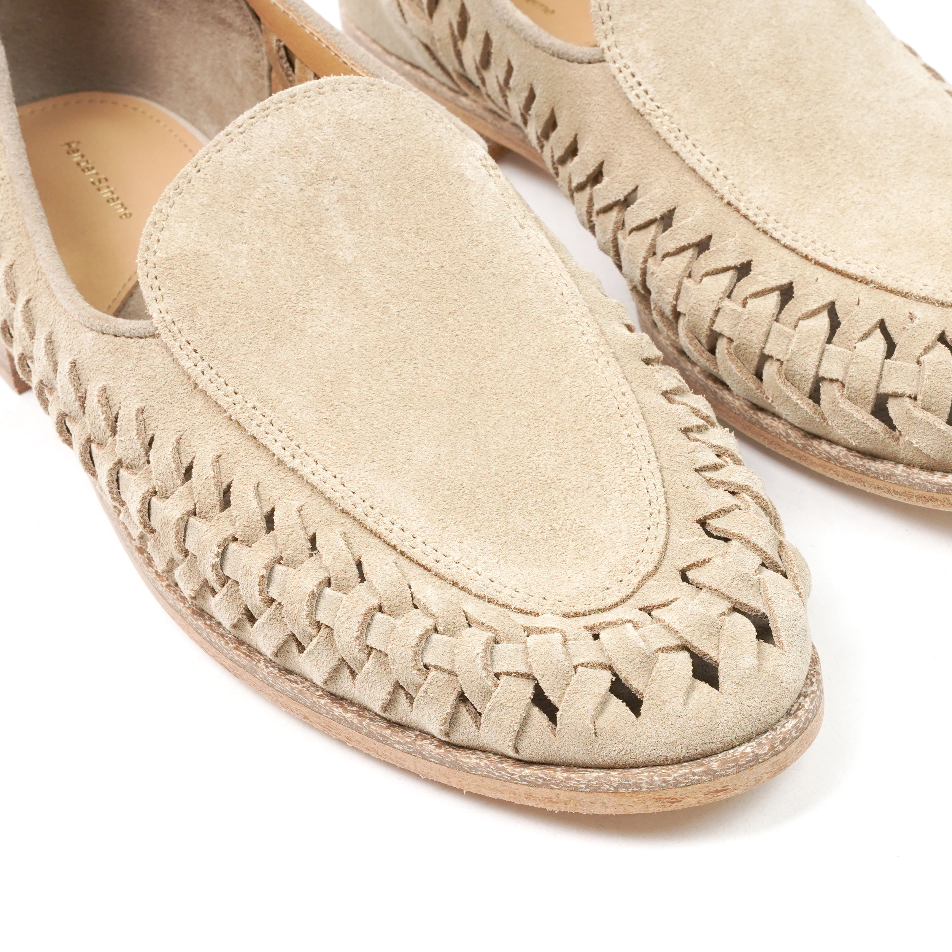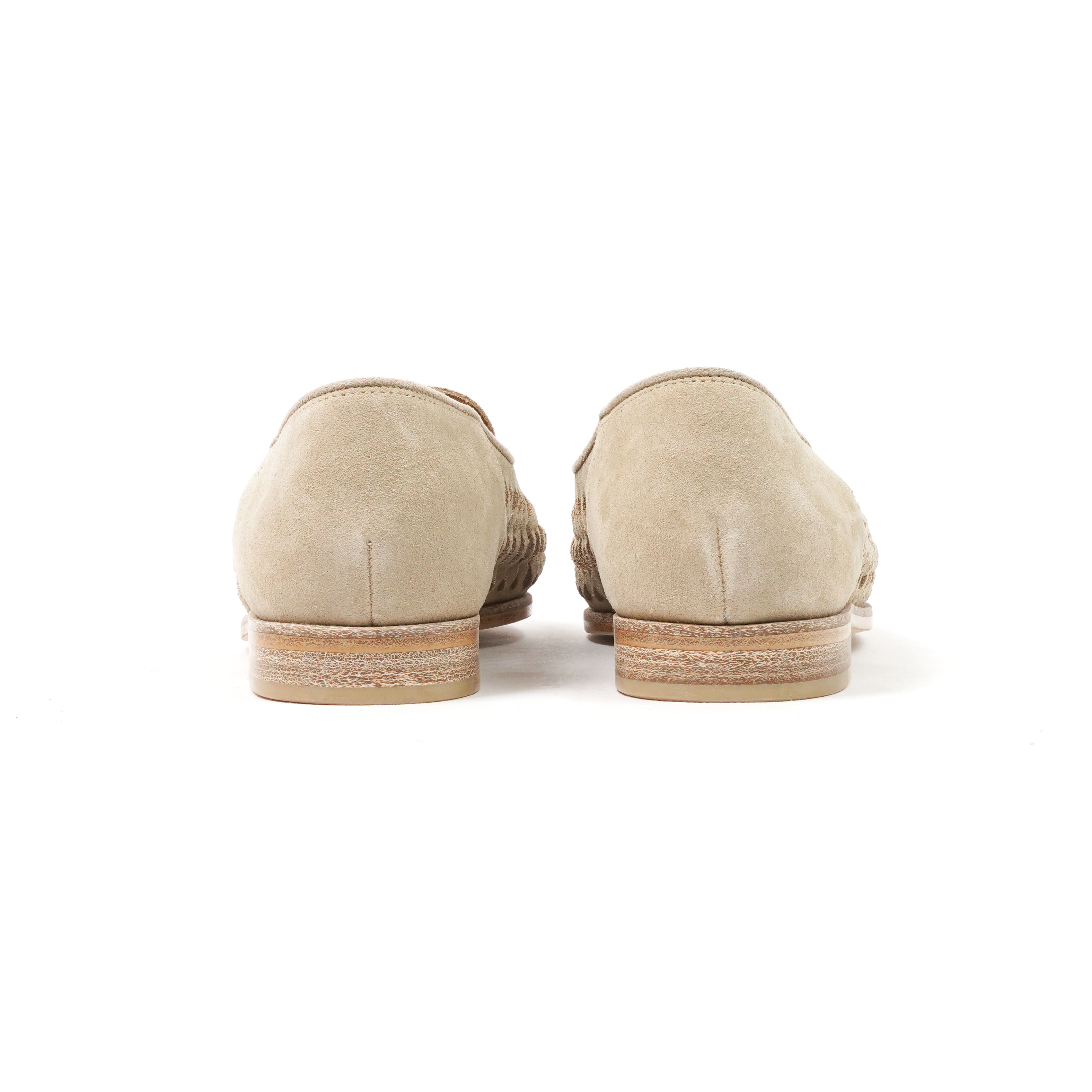 レザーレースを編み込むことでメッシュ状のディテールを形成したスウェードローファー。一枚革の柔らかな質感と、足を包み込むような軽やかな履き心地。スリット部分からさりげなく足元が覗くことで、ソックスや素足などスタイリングによって異なる表情を楽しめます。製法はドレッシーな仕立てをベースにしながら、抜け感のあるデザインとのバランスが◎。レザーソールによる上品さと、スリッポンならではの軽快さを兼ね備えた一足です。素材には天然皮革を使用しているため、色味や風合いには個体差があり、履き込むほどに表情が深まる経年変化も魅力のひとつ。