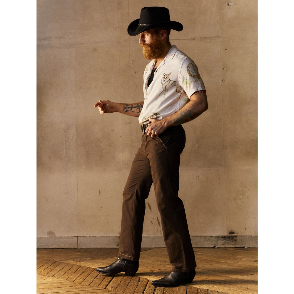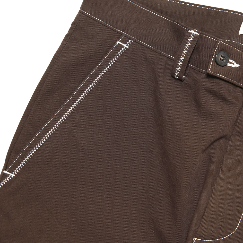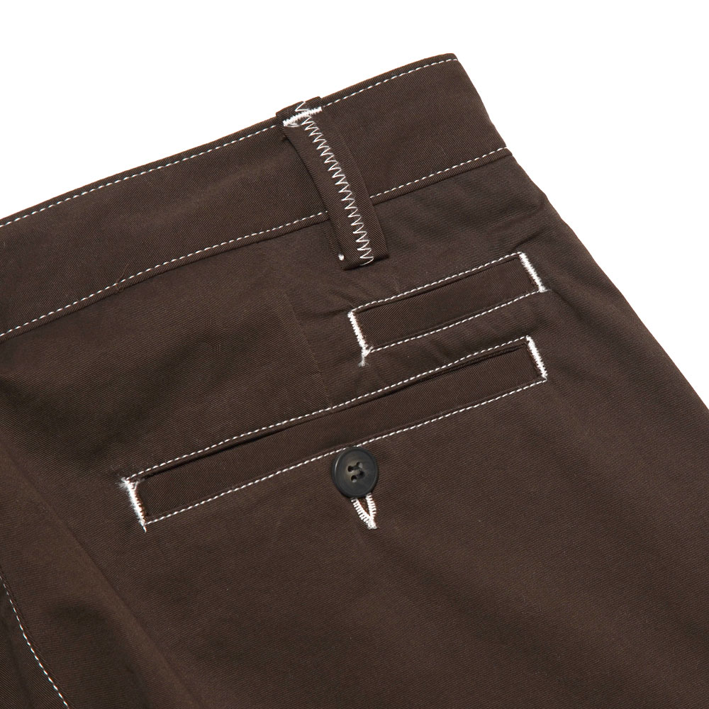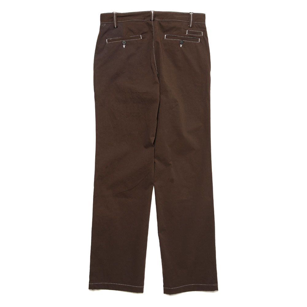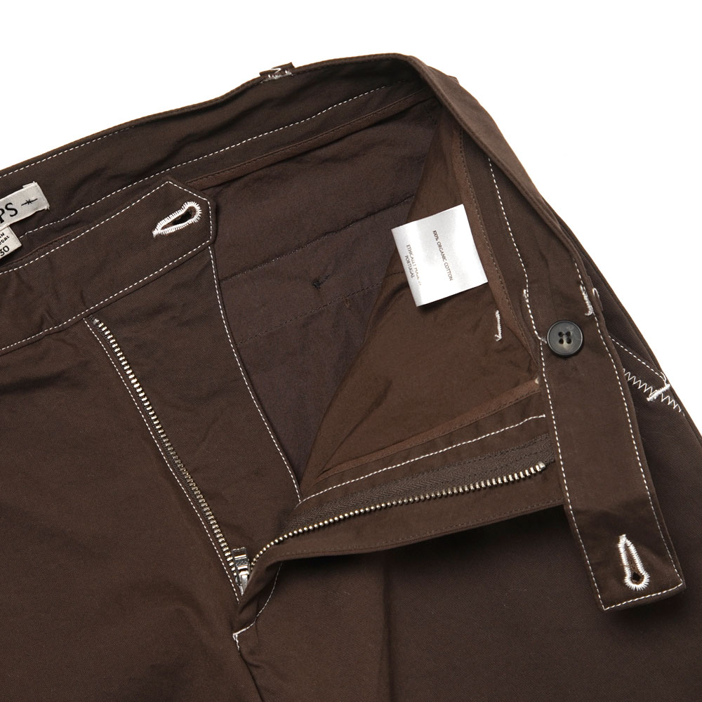 上質なオーガニックコットンを使用した、ノータックのチノトラウザーズ。ややワイドなストレートシルエットと生地によるハリ感による極上のシルエット。上品なダークブラウンに、白のステッチワークデザインのさりげない主張も◎。共地のDAD JACKET SANDとのカラーコントラストをつけてのセットアップスタイルもおすすめです。