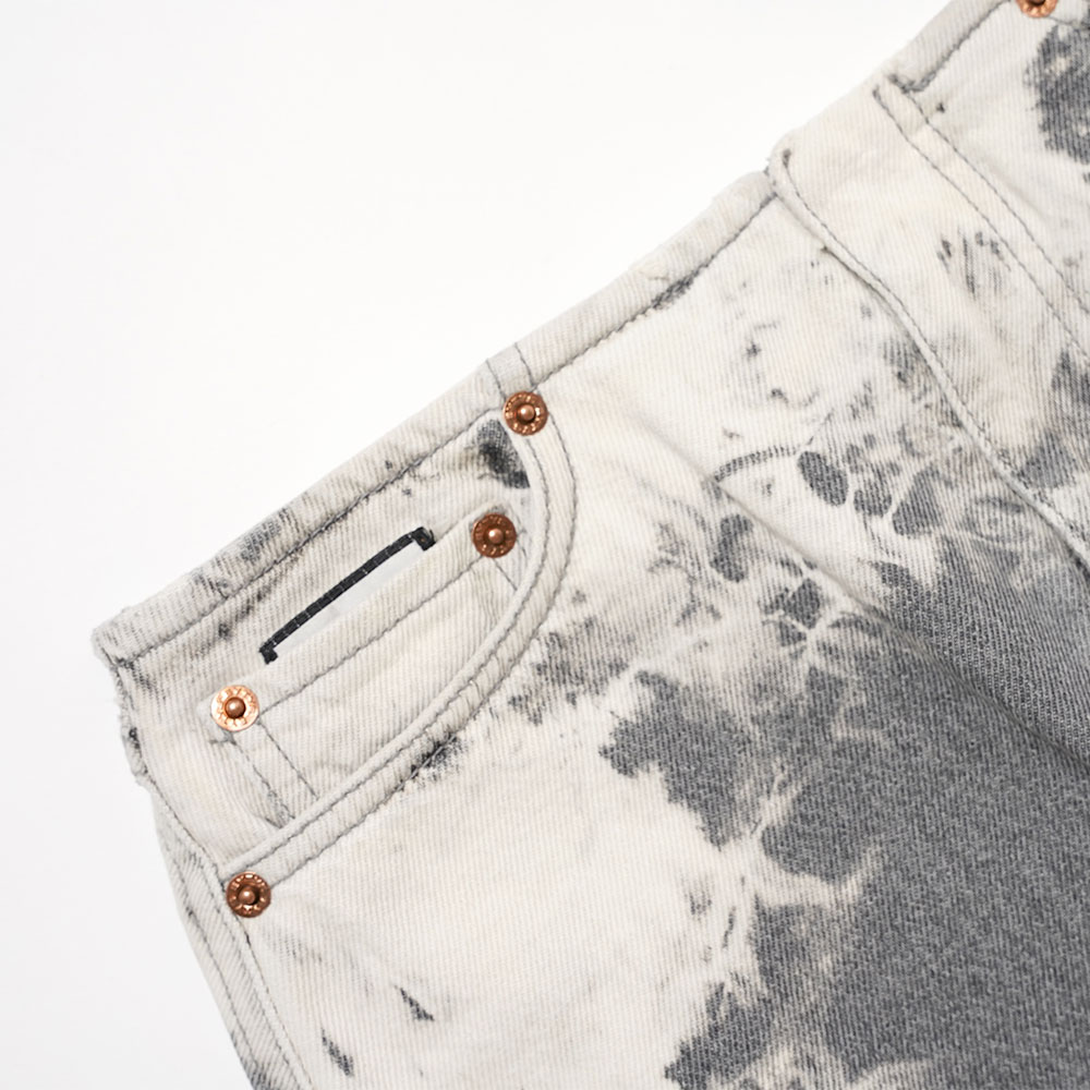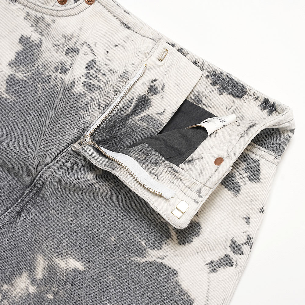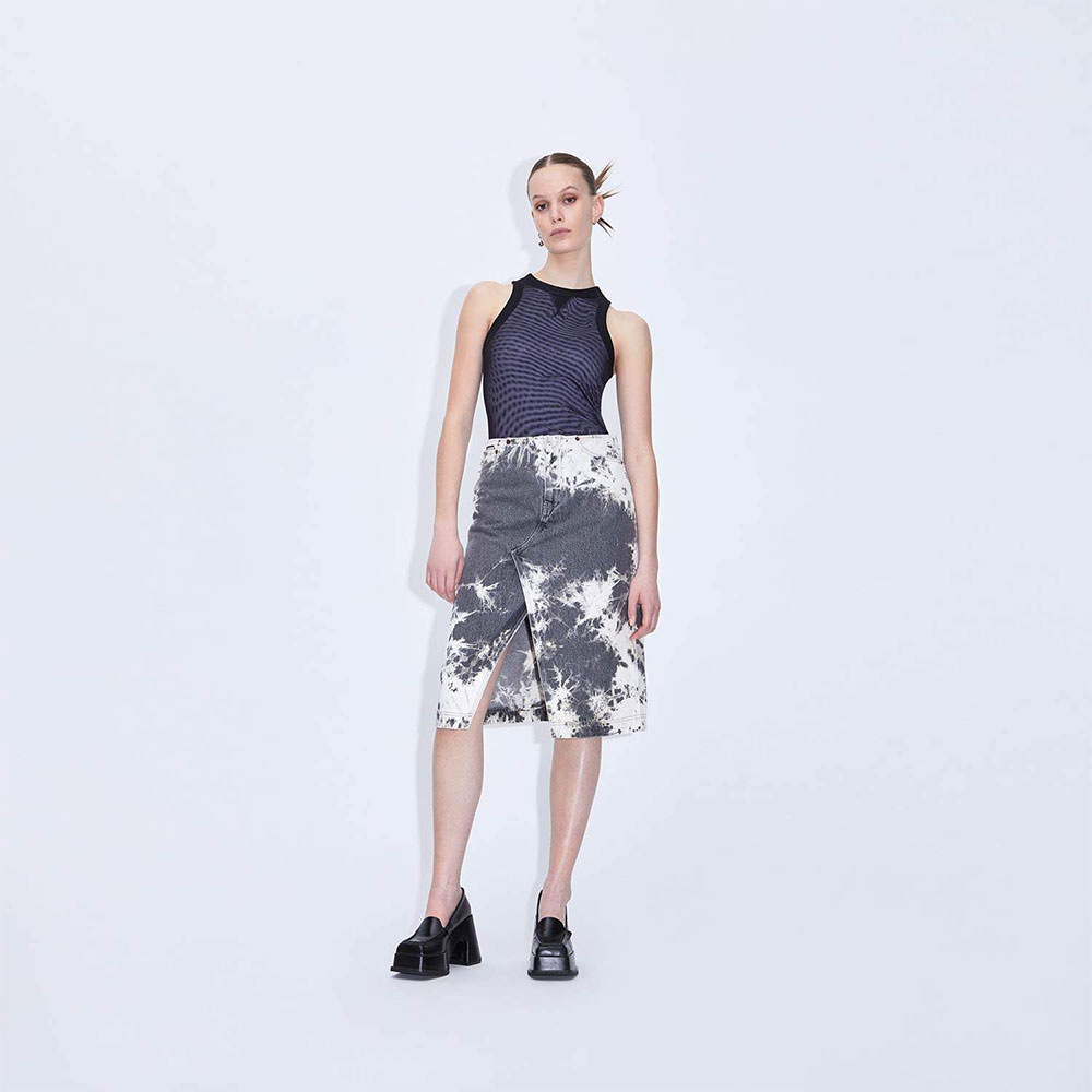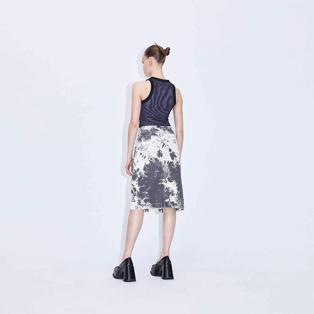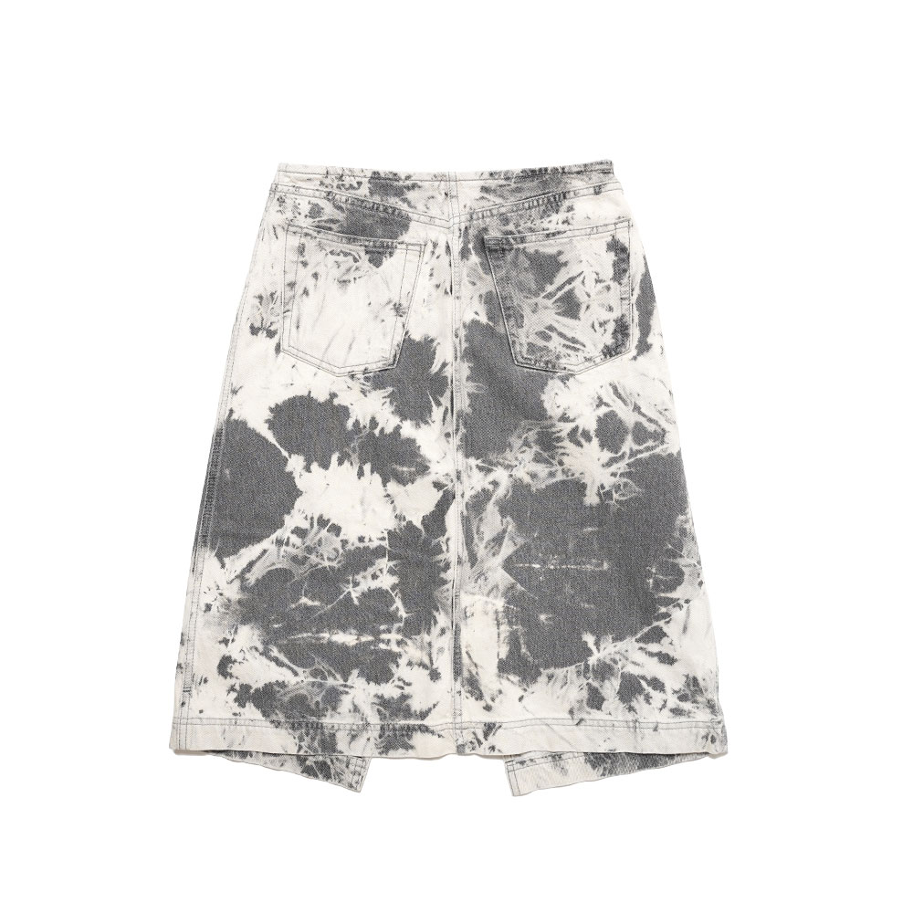 タイダイカラーが印象的なミッドレングスのスカート。ローライズフィット。ウエスト部分の装飾を排したシンプルなデザインが新鮮。パンツとのレイヤードスタイルやカラータイツとの合わせなど、様々なアレンジが楽しめる一着。