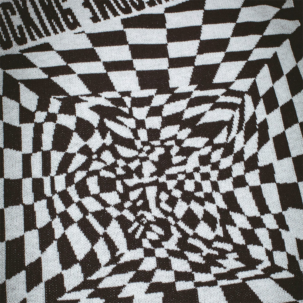 ハリのあるコットンニットを使用したベスト。全面に "Warped "アートワーク。袖と裾はリブ仕上げ。レギュラーフィット。ボックスシルエット。