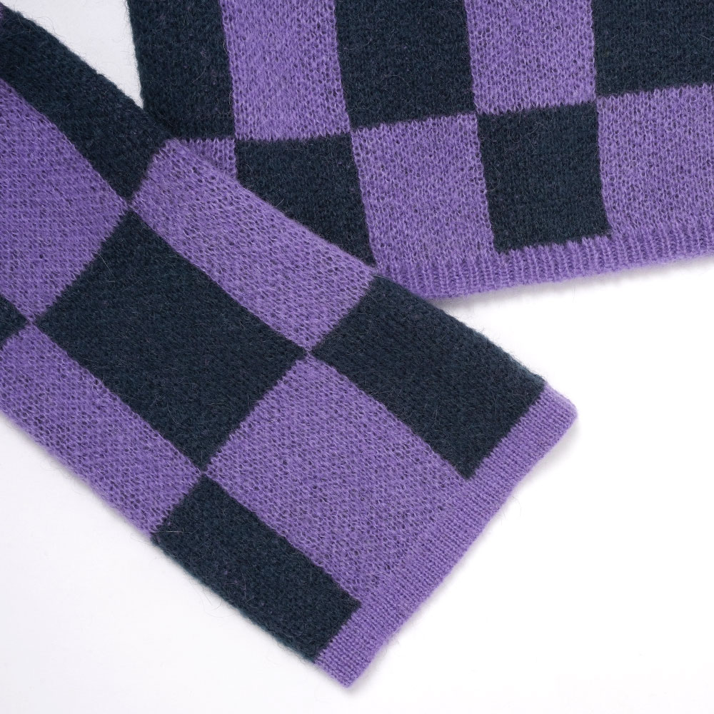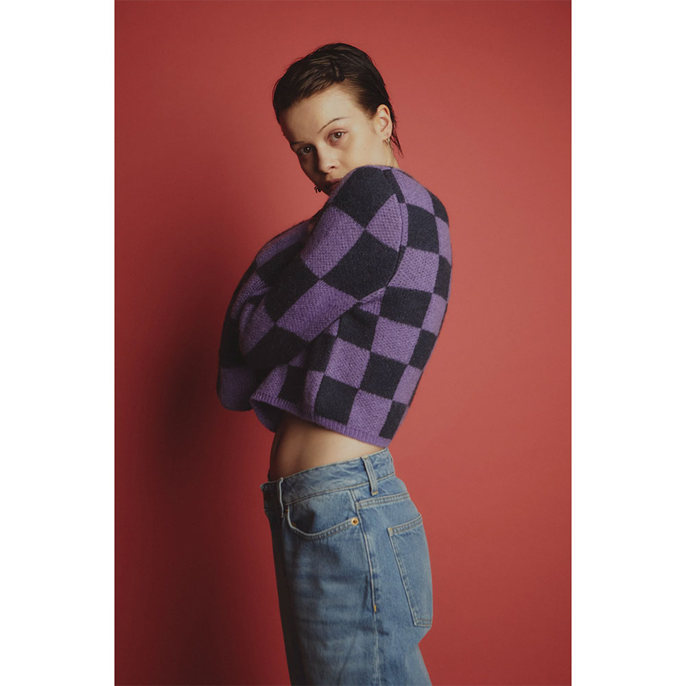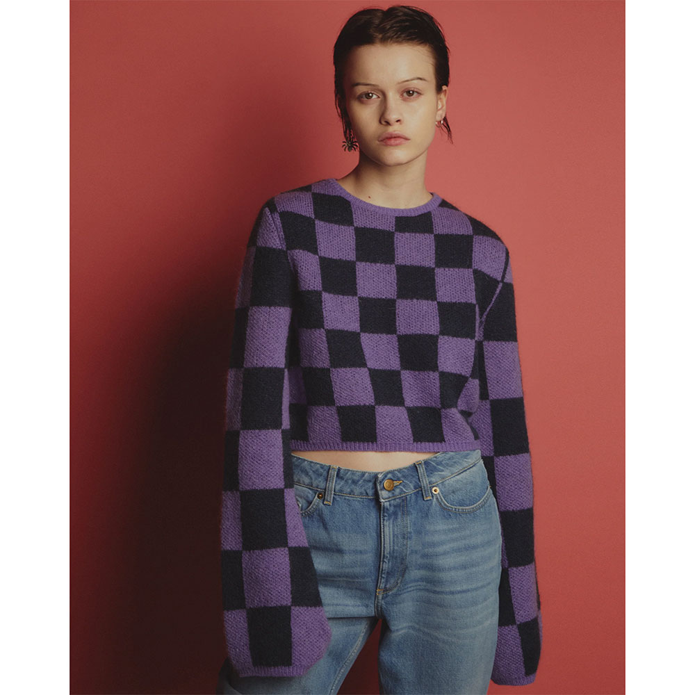 クロップドボディ、トランペットスリーブ、チェック柄が特徴のニット・トップ。ドライでヘアリーな風合いのモヘア混素材。リラックス~レギュラーフィット。