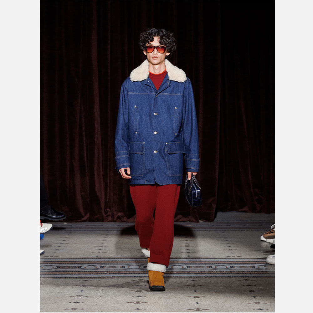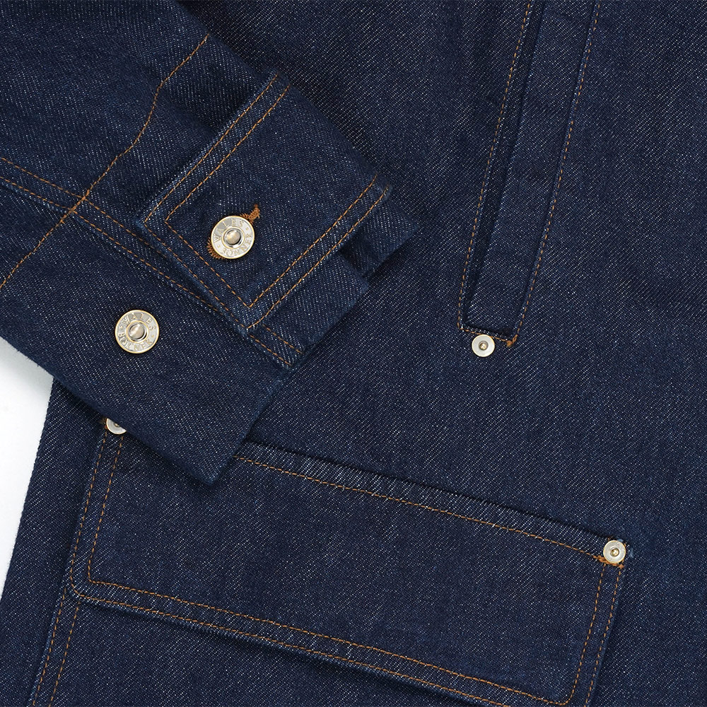 アメリカのプレッピーとイギリスのユースカルチャーのミックススタイルを提示した今シーズンらしいデニムコート。厚手ながらソフトな風合いの上質なコットンデニム生地。70年代US風デザインのインディゴデニムジャケットを90年代UKストリートを想起させるオーバーサイズに。ミドル丈で縦長のシルエット。ブランドロゴ刻印のオリジナルボタン&リベットがアクセント。