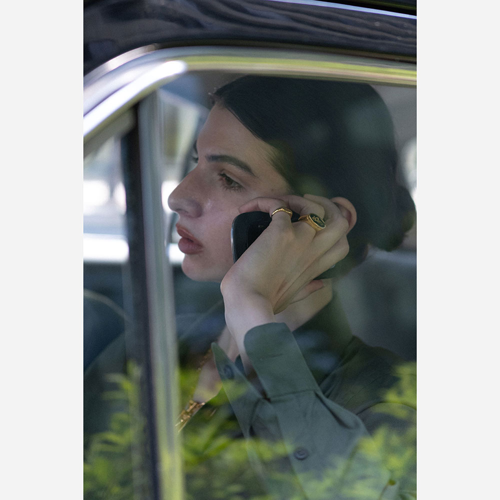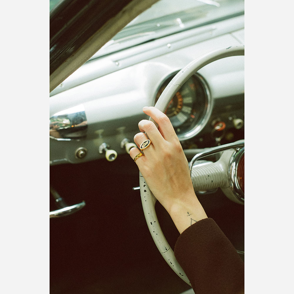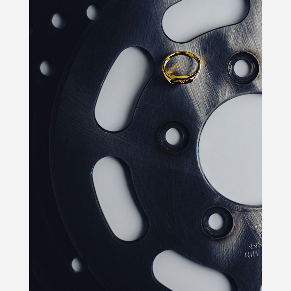 ブランドロゴを配した定番シグネットリングの新型。ナローなシェイプでよりミニマルなデザイン。18KGP。ユニセックススタイル。