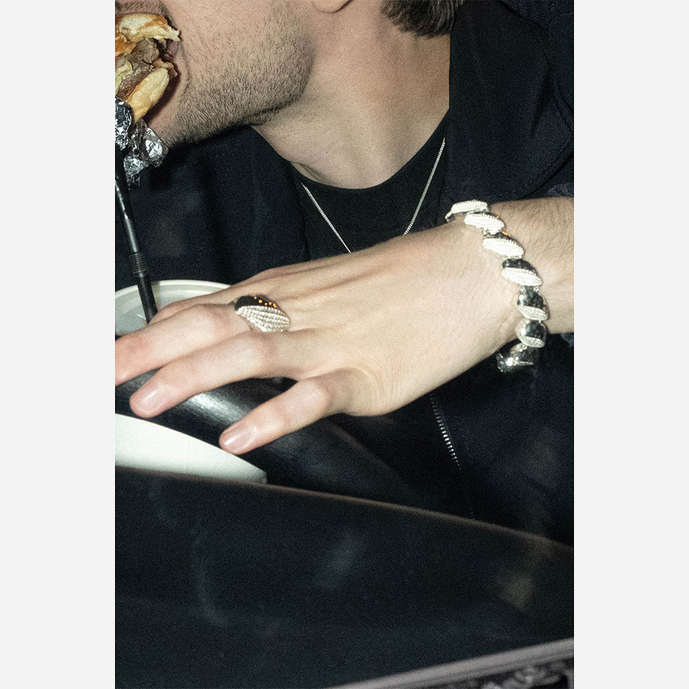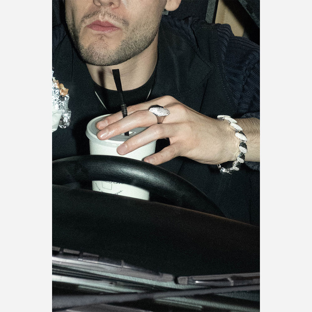 モータースポーツにおけるダートコース(土や砂を細かく敷いた走路)を走り抜けた車のタイヤ痕をモチーフとしたデザインが特徴のパーツをつなぎ合わせたブレスレット。SILVER 925。ユニセックススタイル。