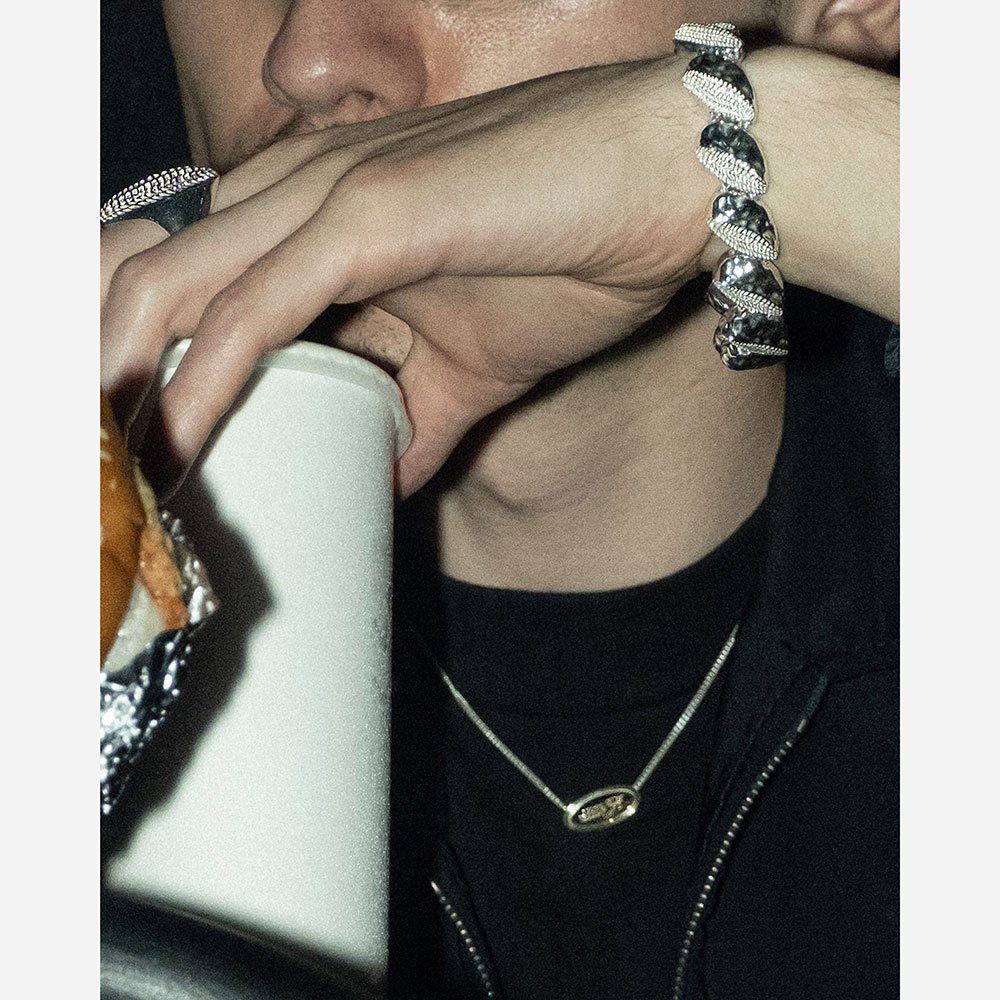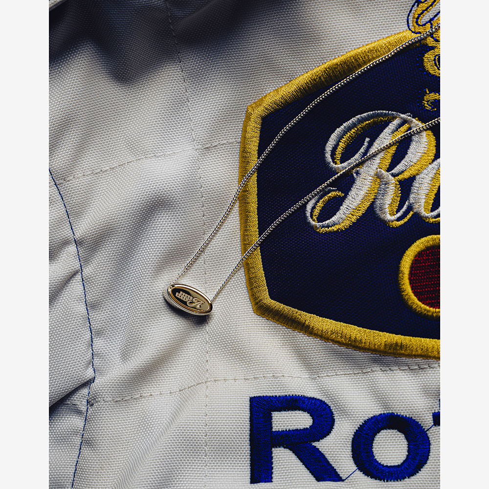 アイコニックなエンブレムロゴが刻印された小ぶりなペンダントトップを合わせたナローネックレス。K10を使用したさりげない高級感が特徴。ユニセックススタイル。