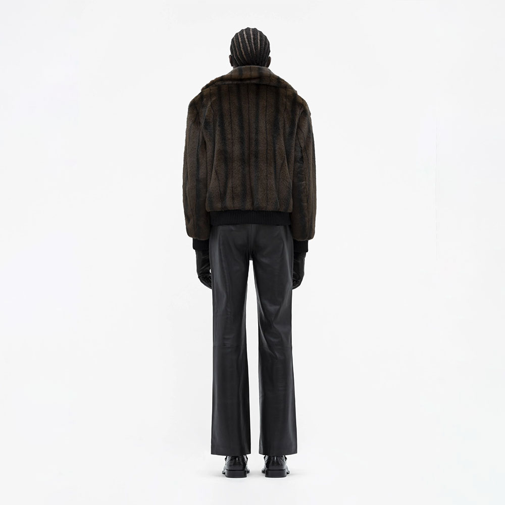 フェイクミンクファーのショートジャケット/ブルゾン。襟つき。ジッパーフロント。ウェルトポケット。裾と袖口はブラックのリブ素材。サテンの総裏地で滑らかな着心地。このブランドらしいコンパクトなフィット感で、ユニセックスで着用可能。