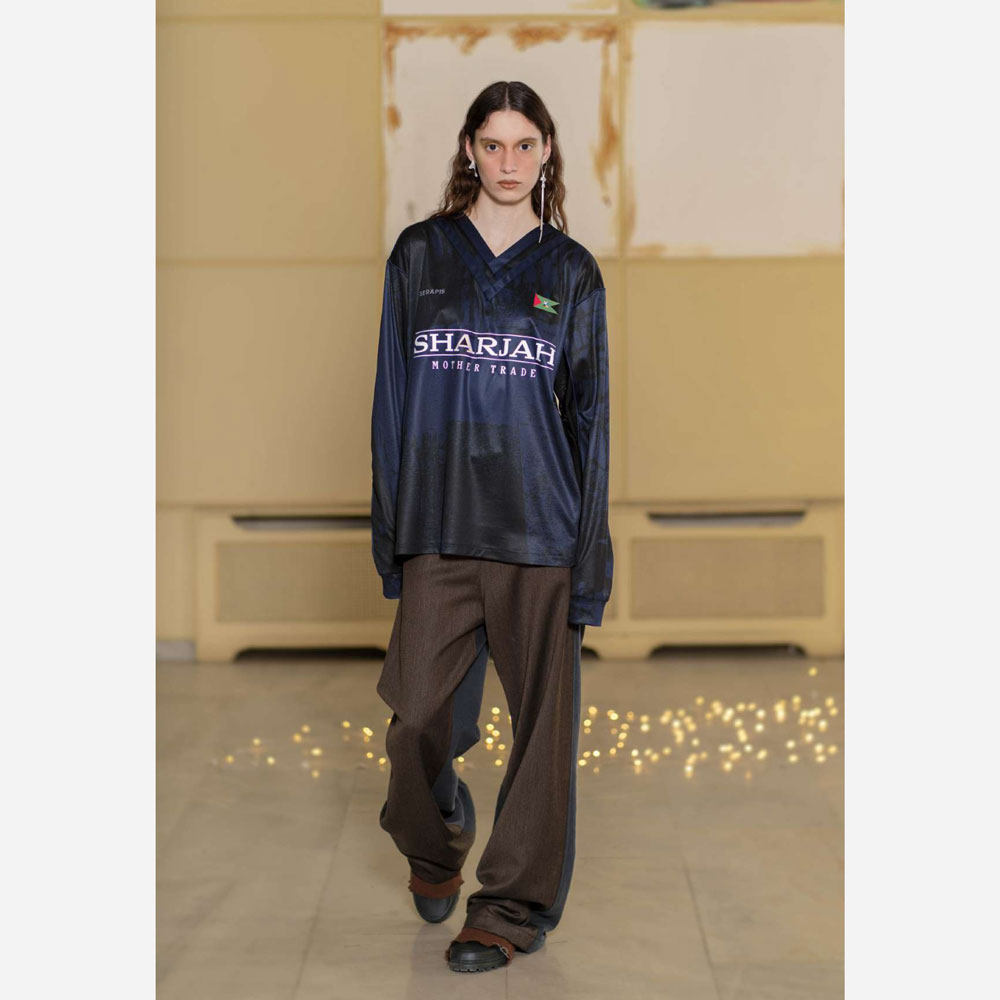 セーラーパンツからインスパイアされたフロントデザインに、バックはスウェット素材をドッキング。ワイドストレートシルエットでロングレングス。ハイウエスト仕様で腰履きにも最適。