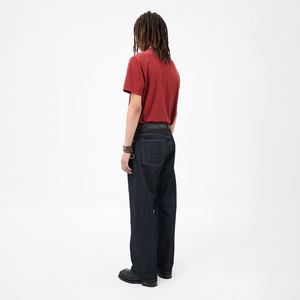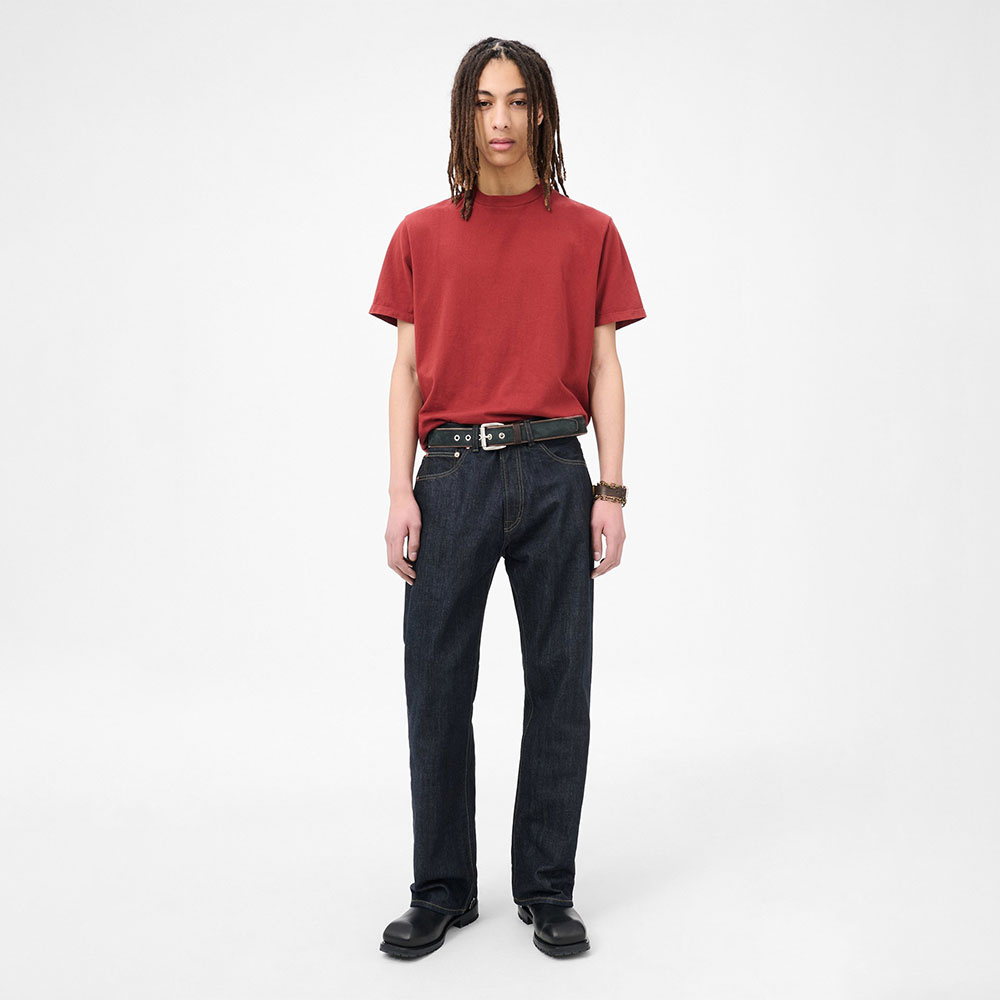 *本品は厳選された素材を用い、独自の加工工程を経て製造されています。この工程により、各製品に個別の色合いと風合いが生まれます。この技術により、明るい色の衣類や表面に色移りする場合があります。着用者の体型に馴染み、時間の経過とともに自然なダメージが生じ、デザインプロセスが完成します。