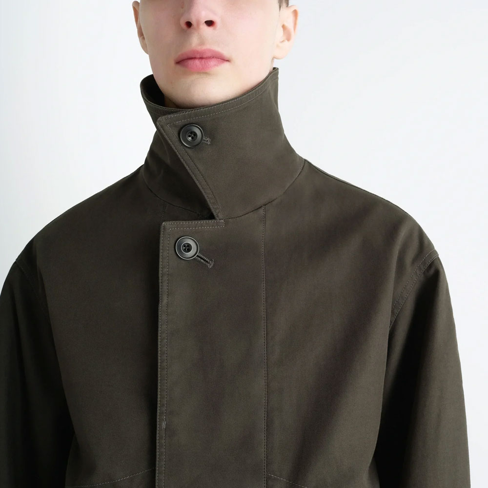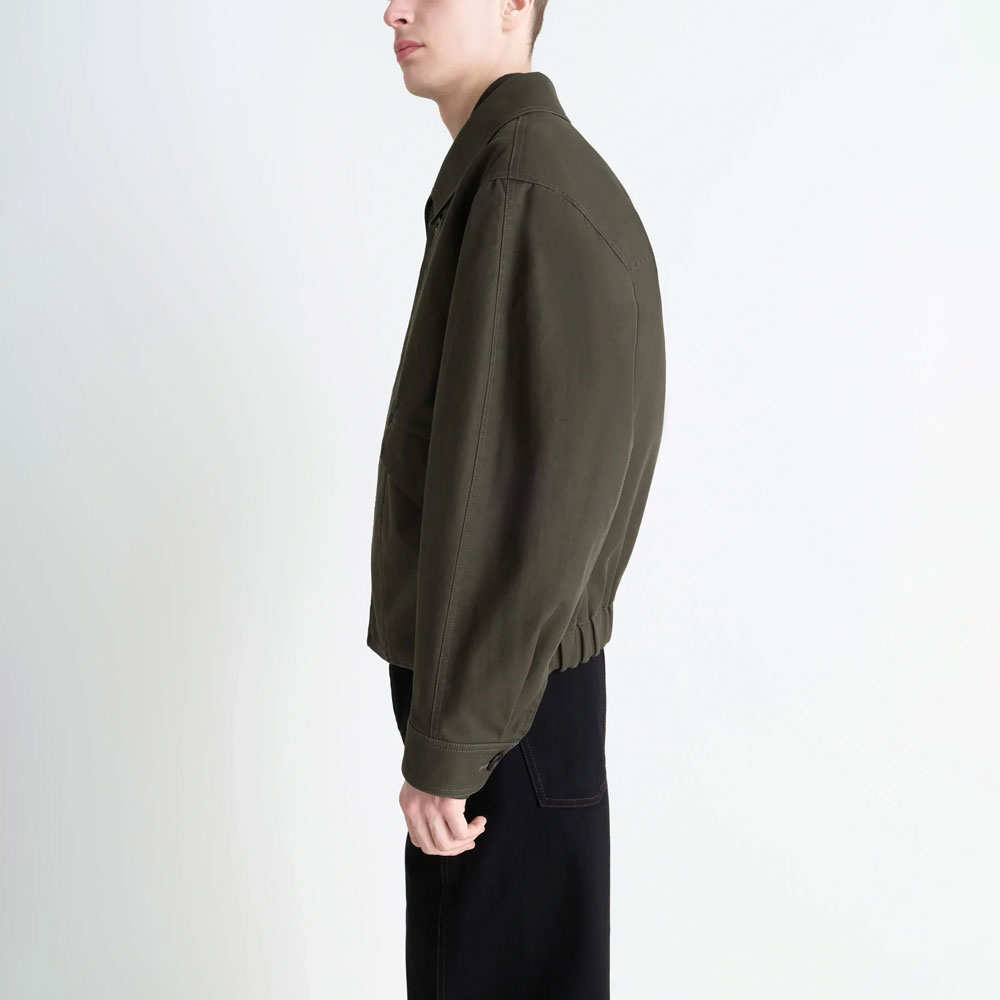 高密度に織り上げたコットンギャバジンを使用し、上品なハリと耐久性を備えたユニセックスブルゾン。ボクシーかつややクロップド丈のオーバーサイズフィット。フラップ付きポケットとトップステッチがデザインのアクセントに。襟を立てての着用も可能。