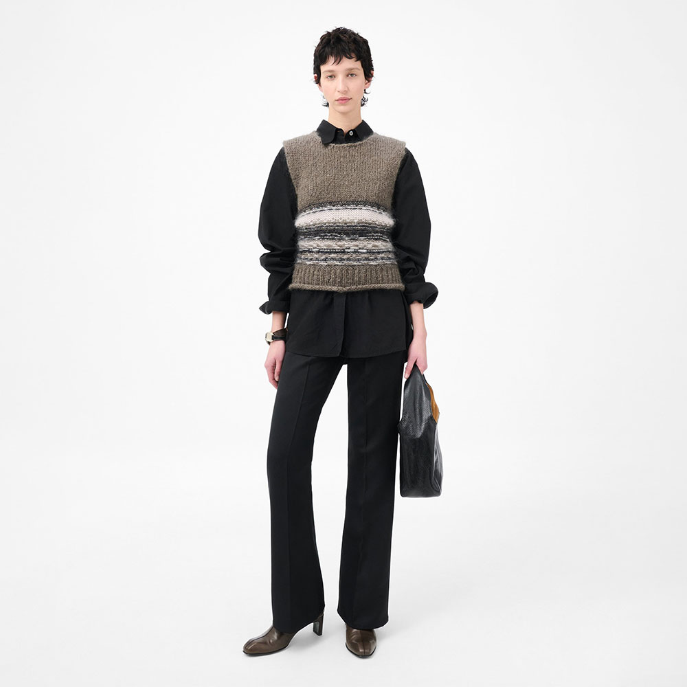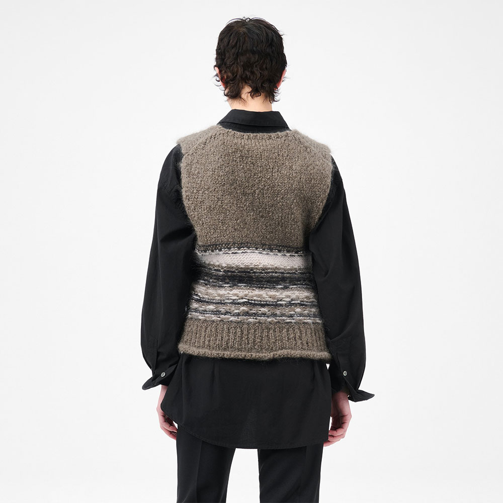 イタリア製モヘアとウール糸で製造されたレディースプリーザータンクは、ゆったりとしたボックスシルエットが特徴。下部はリバースフェアアイル編み、上部はプレーンニット、ノースリーブ構造、フレンチショルダー、ロールヘムラインを採用。