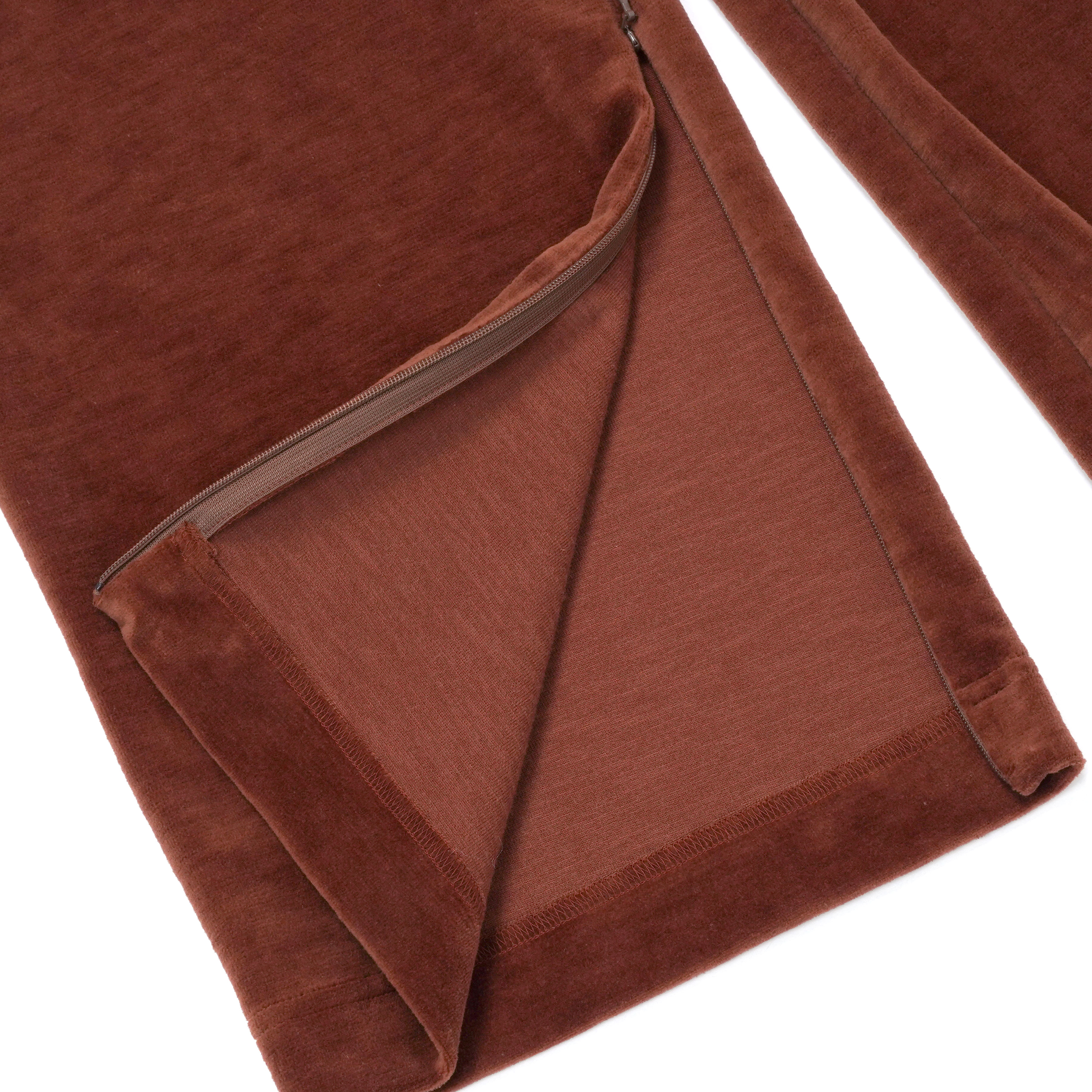 ウエストから裾に向けて真っ直ぐと緩やかに落ちる、ストレートシルエットのベロアパンツになります。裾に付属されたジップを開くとややフレア調のシルエットに。カジュアルから、ドレス迄汎用性の高い一本。
