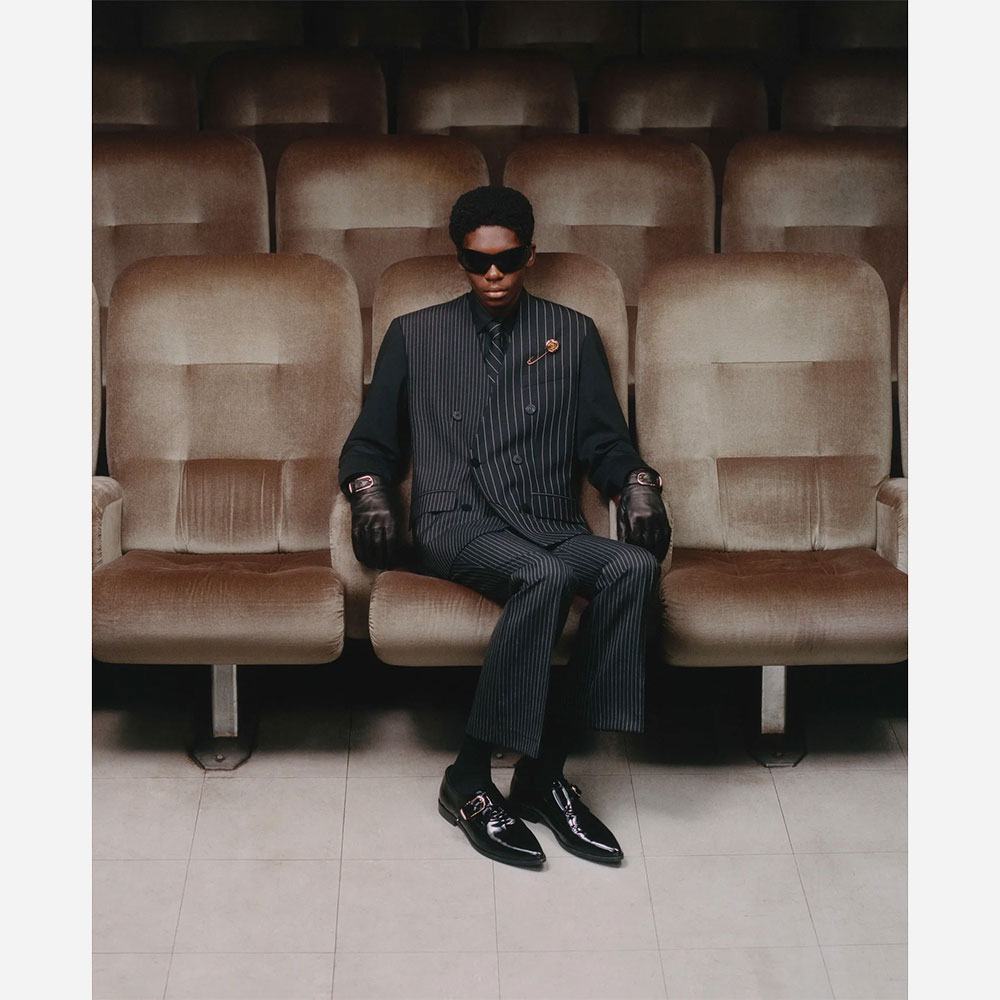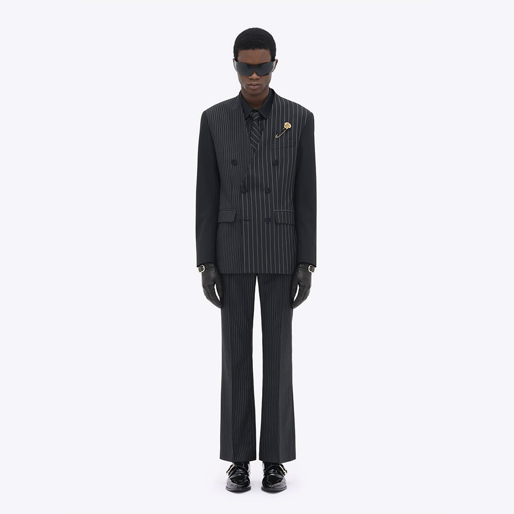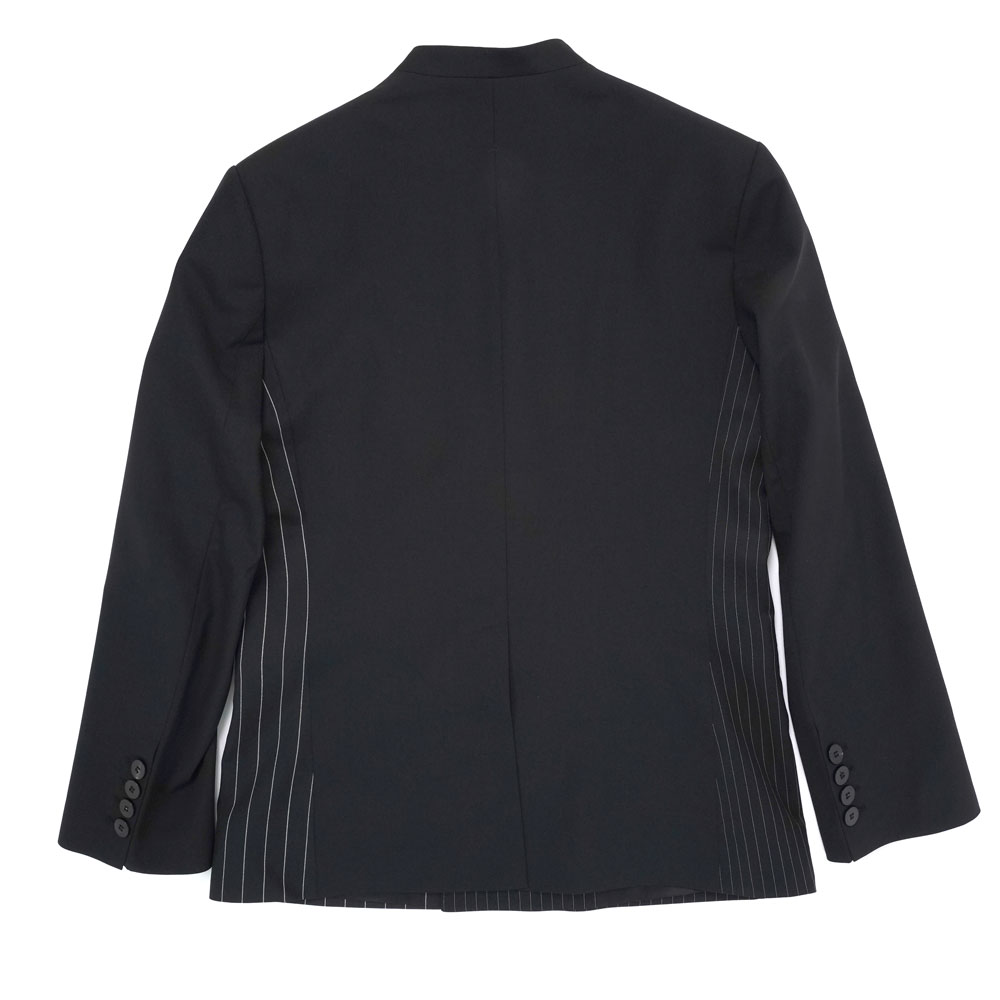 ブランドのスタイルの根幹をなすノーカラーテーラードジャケット。イタリア製のバージンウールツイルを使用。サテンのピークドラペルカラーのタキシード仕様。パッド入りショルダー。センターベント。サテン総裏地の内側にもウェルトポケット付き。