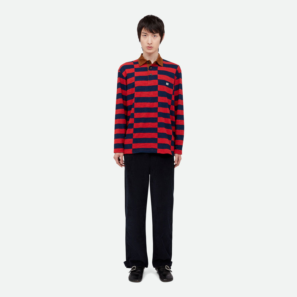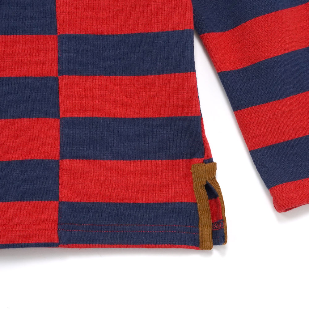 日本製キャンバス生地を使用し、リズミカルなカラーブロックストライプ柄と、コントラストの効いたコーデュロイのポロカラーが特徴的なポロシャツになります。レギュラーフィット。