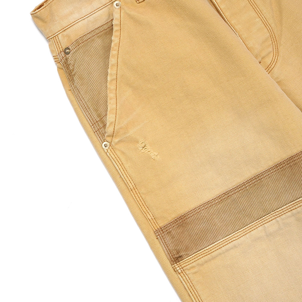 一点一点職人による手作業で加工されたキャンバス地パンツ。コーデュロイのコントラストとダメージ加工のディテールが特徴。 生地の職人技による性質上、一点一点が個体差があり、着用者の体型に合わせて徐々に形作られていきます。