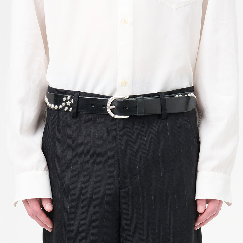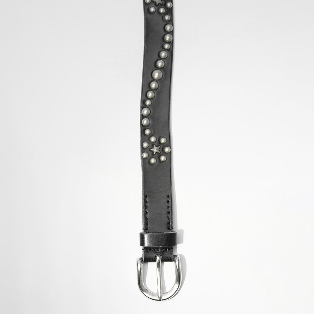 イギリス製の革をポルトガルで手作業で裁断。幅3.5cm。スタッズ付きスターフォールデザイン、金属製ピンバックル留め、レザーキーパー、リップストップ素材のダストバッグ付き。