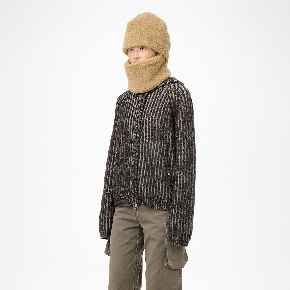 スペイン製フェイクシアーリング生地(ウール・アクリル・ポリエステル混紡)を使用した存在感のあるスヌード。ィット感のある帽子デザインに、顔の一部を覆えるネックスヌードが一体成型されています。頭部はぴったりフィットし、首周りはゆったりとしたシルエットです。