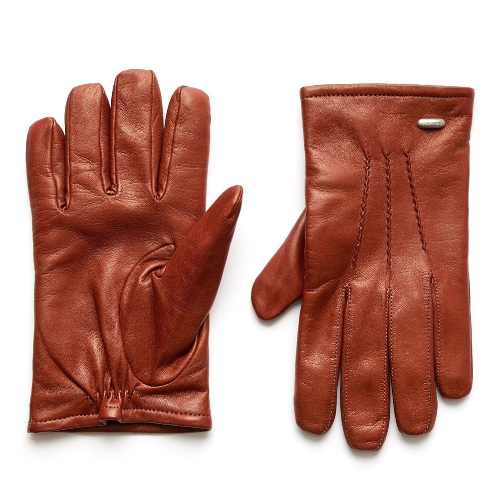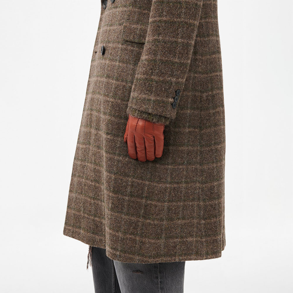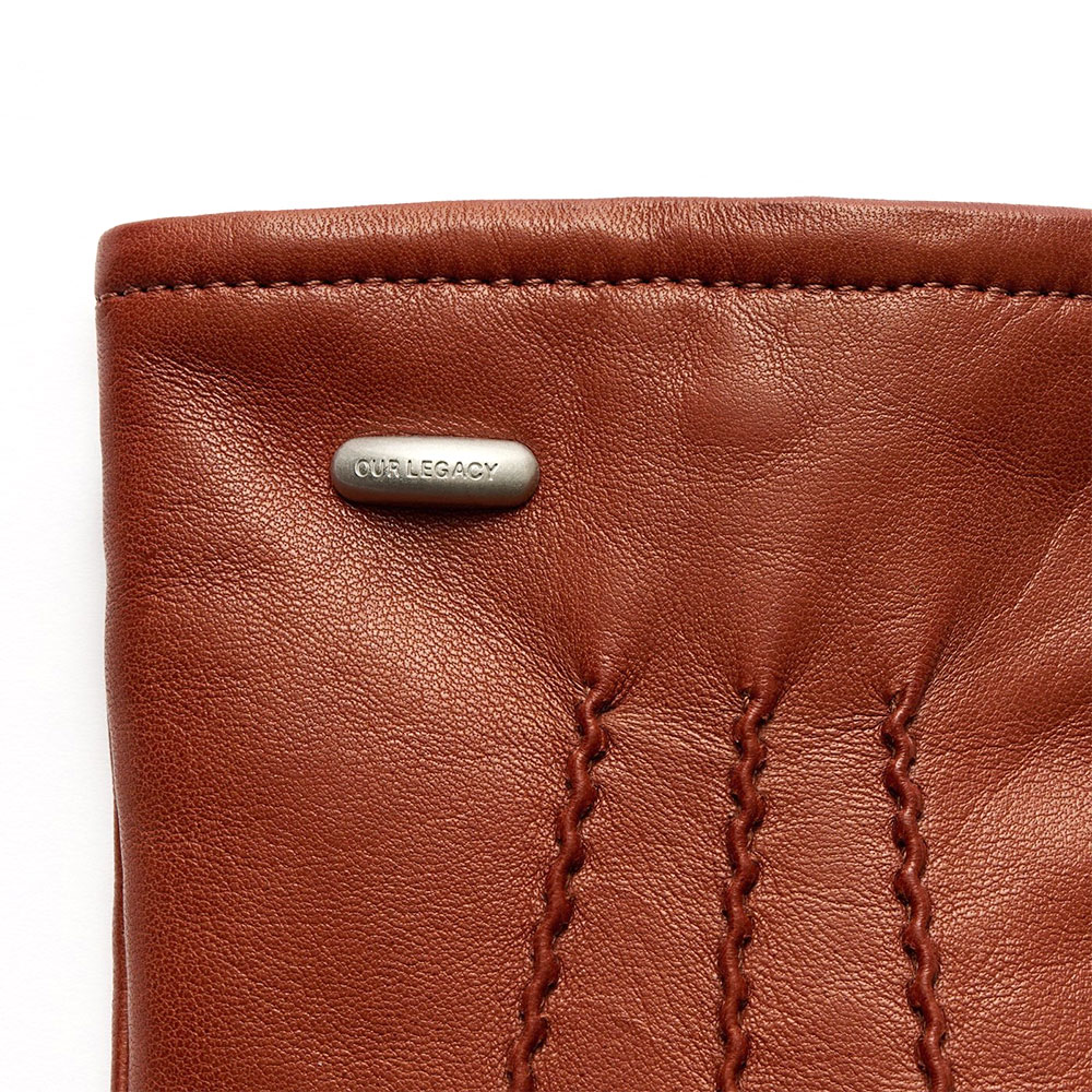 アンバーブラウンのナッパ革を使用したレザーグローブ。イタリア製ナッパラムレザーにウール裏地を施したメンズグローブは、メタル製のOur Legacyリベット、ツインニードルトップステッチ、伸縮性のあるジグザグステッチが特徴です。