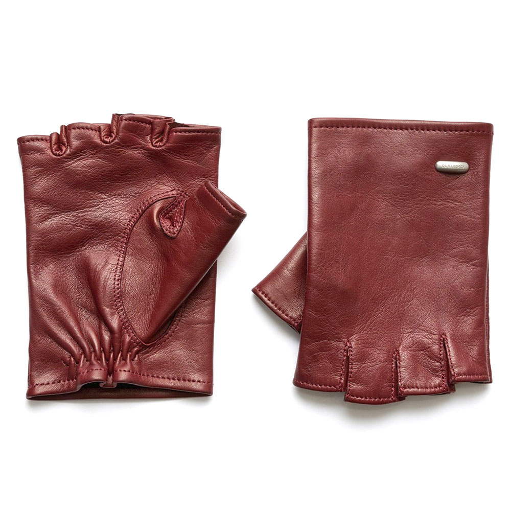 ナッパラムレザーを使用したバイカーグローブ。イタリア製ナッパラムレザーで作られた本品は、カットオフフィンガー、メタル製オーレガシービーンリベット、伸縮性のあるカフが特徴です。