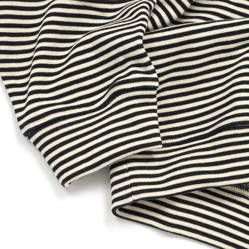 フレンチテリー素材を使用したロングスリーブのボーダーポロ。クリーンなモノトーン配色に、MARNIらしい遊びのニュアンスが落とし込まれています。ゆとりのあるボックスシルエットにやや長めの着丈設定で、リラックスした印象。一枚着としてはもちろん、ジャケットやブルゾンのインナーとしてもバランス良くまとまります。クラシックなボーダーを、現代的な感覚で再構築した一着。