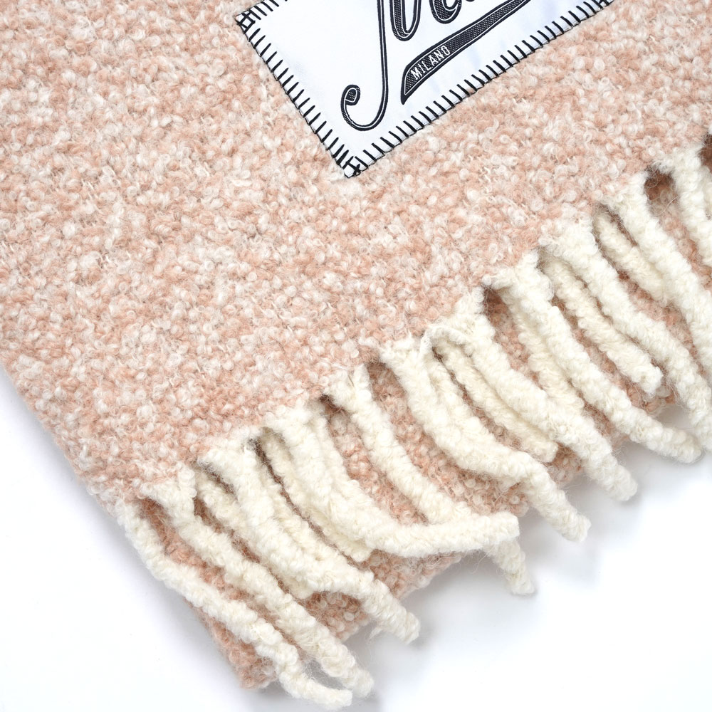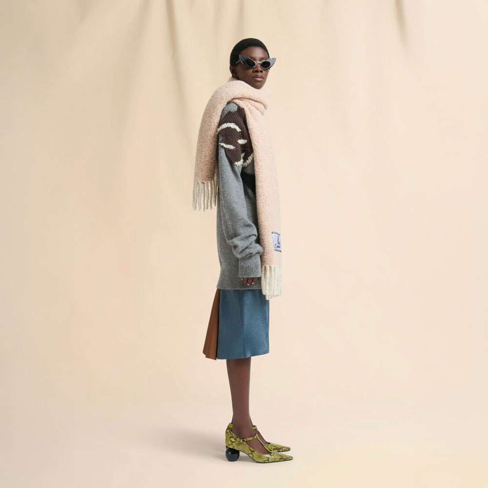 アルパカ混紡のブークレ織りマフラー。 ポップなフリンジディティール、筆記体MARNIロゴのサテン製タグがアクセント。大きなサイズを活かしショールのように纏えばアウターの代わりにもなる優れもの。