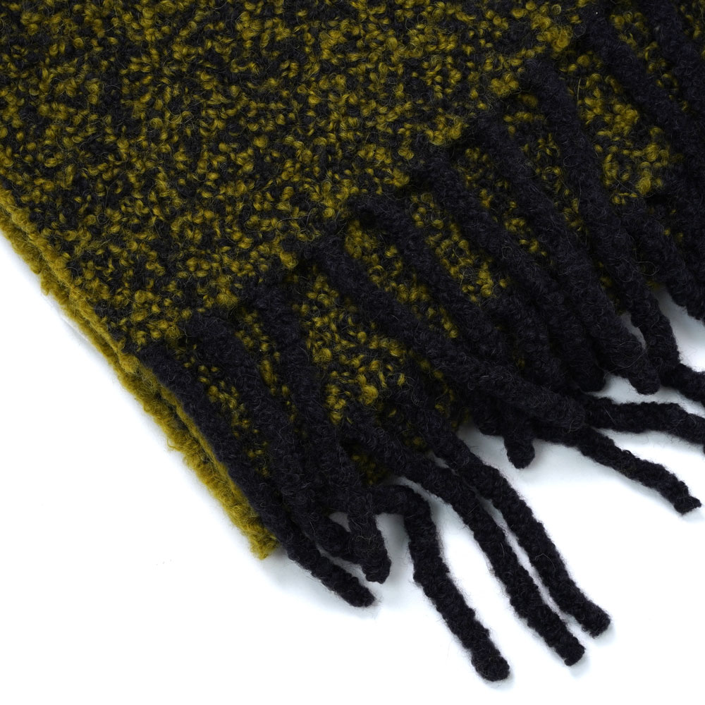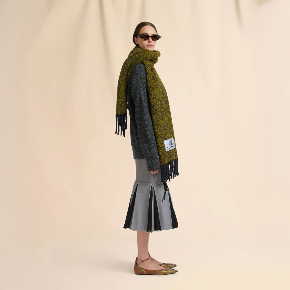 アルパカ混紡のブークレ織りマフラー。 ポップなフリンジディティール、筆記体MARNIロゴのサテン製タグがアクセント。大きなサイズを活かしショールのように纏えばアウターの代わりにもなる優れもの。